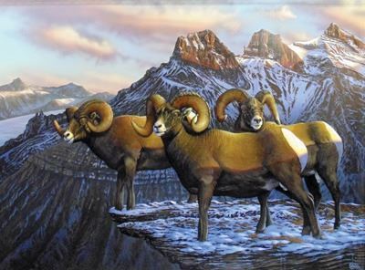 Eddie LeRoy, depicting three bighorns in some rugged Rocky
