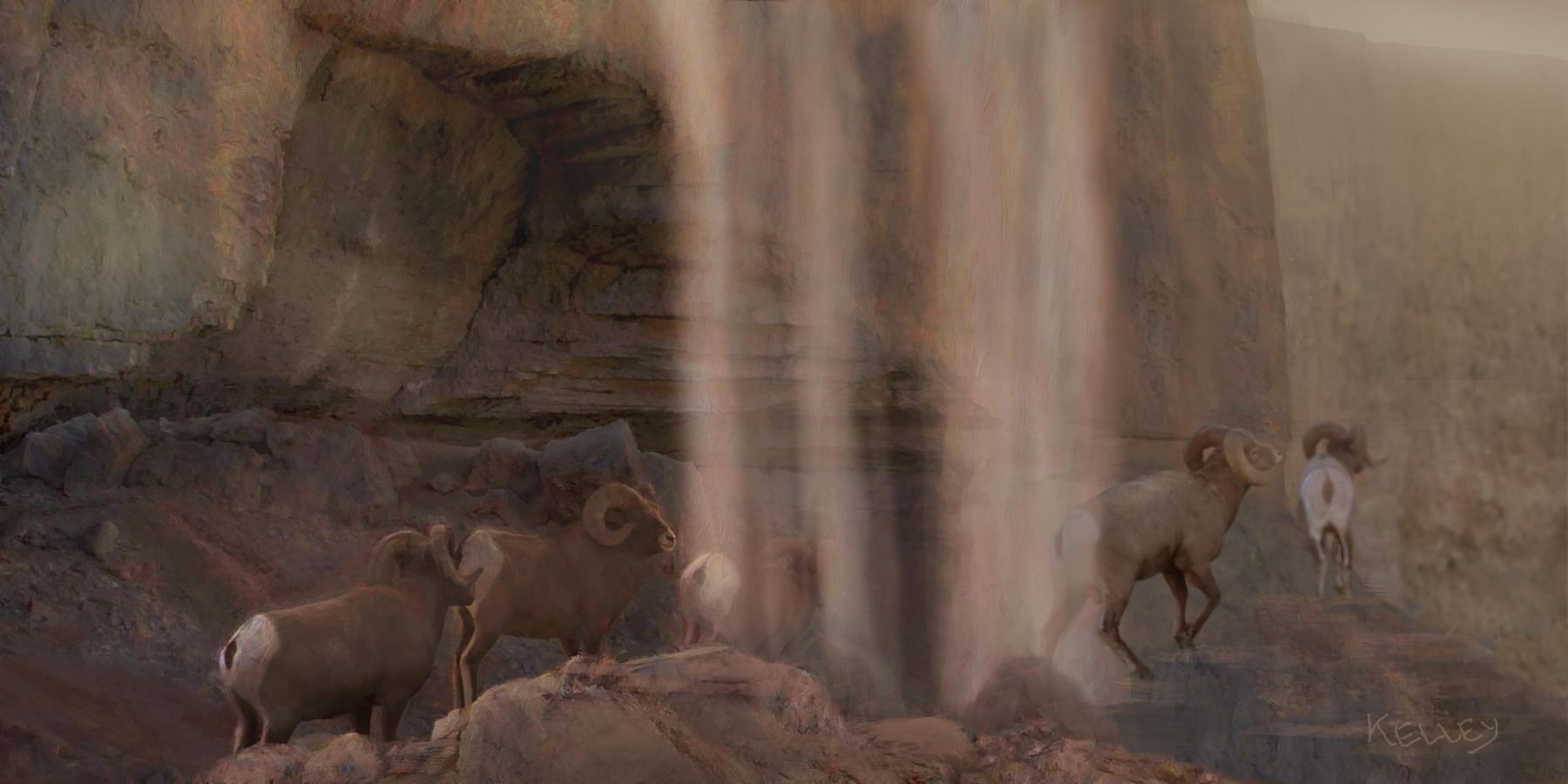 DONATION: “Rocky Mountain Shower” is a giclee print of Bighorns traveling through terrain typical of Wyoming’s Darby Canyon.