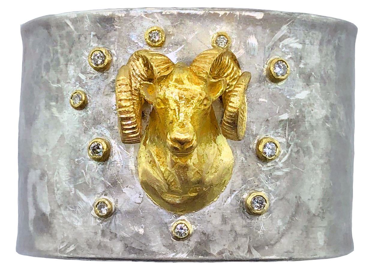 Donation: This is an 18K & Silver Bighorn Sheep Diamond Cuff. This Cuff features an 18K Big Horn Sheep surrounded by Bezel Set Diamonds.