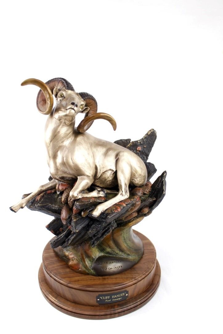 DONATION: “Cliff Hanger” is Alaskan Artist Frank Entsminger’s fifth Dall’s/Stone’s sheep sculpture and the first to depict a magnificent northern sheep ram laying down. Frank’s previous four Dall’s/Stone’s sheep bronze pieces where editions of 26 which have all sold out therefore bringing the idea for a new sheep bronze. Frank's love of the mountains, mountains hunting, & Dall’s sheep is another of his inspirations for this new piece. Frank used numerous photos of some of the largest rams taken to inspire the horn style. This investment quality bronze is mounted on a beautiful dark walnut base with lazy Susan mounted in the bottom so it can swivel to be viewed from all angles of your trophy room, office, or den. The piece is approximately 17”T x 14”W x 11”D and weighs around 32 lbs.