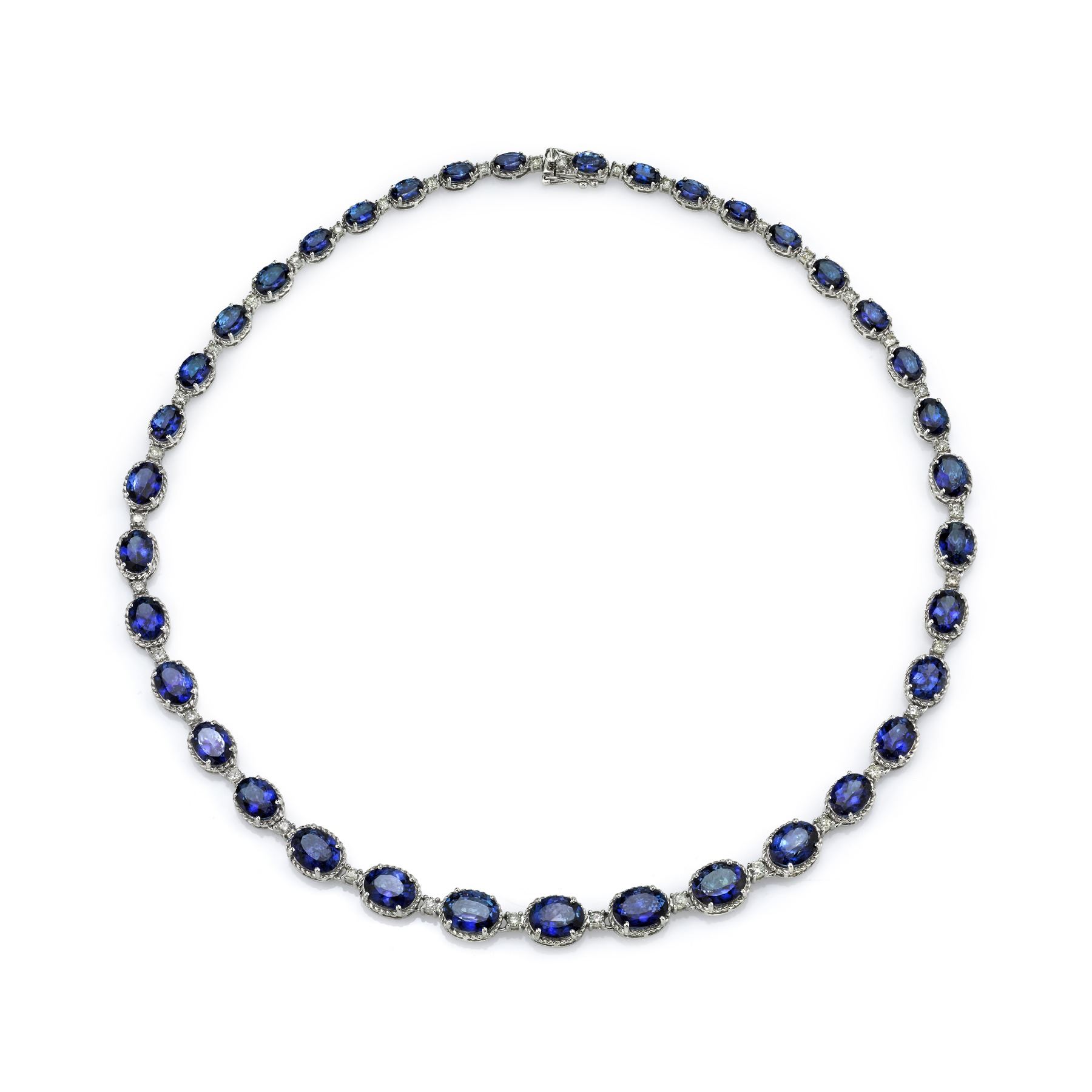 This oval Tanzanite & Diamond necklace has 35.00 carats of tanzanite with 2.00 carats of diamonds. Tanzanite is Blue Violet vivid in color. The diamonds are G color and Vs2 in clarity.