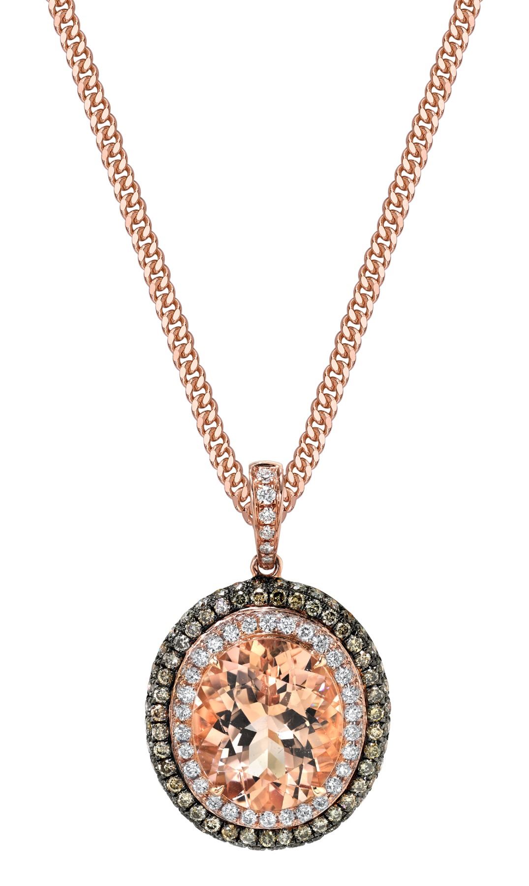 This Morganite and diamond pendant is set in 14 karat rose gold and has natural chocolate and white diamonds. Morganite is 8.00 carats with 1.01 carats of chocolate diamonds and 0.70 carats of white diamonds. Diamonds are Vs in clarity.