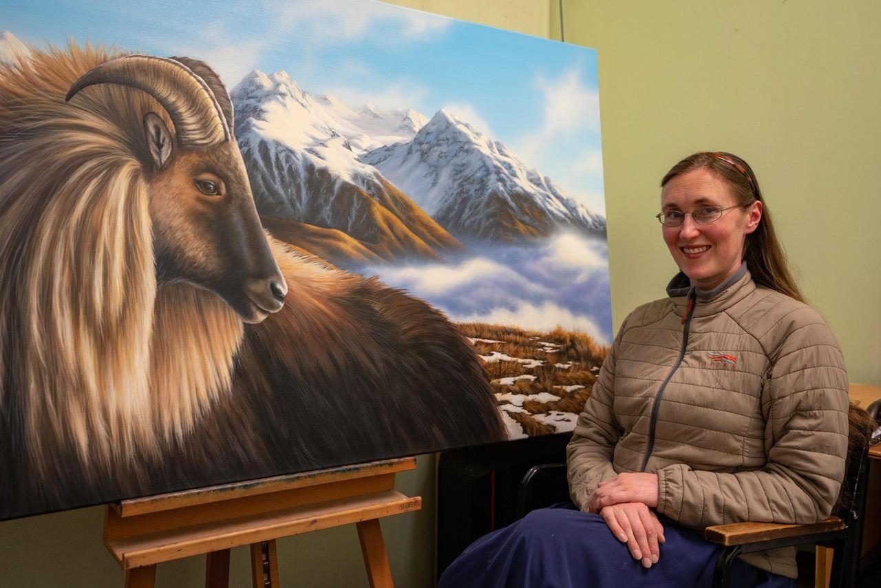 “I was recently on my first tahr hunt with my guide/husband Zion Pilgrim (Wilderness Quest NZ) and was successful in taking a beautiful bull tahr. The whole alpine hunting experience was beyond what I could have imagined and to see the tahr in the mountains inspired me to capture their majestic spirit on canvas. When I saw them threatened in our country, by people who had no understanding of these animals, I knew it was time for this painting. My hope is that it will help raise awareness, in New Zealand and abroad, to the value of these beautiful creatures.”