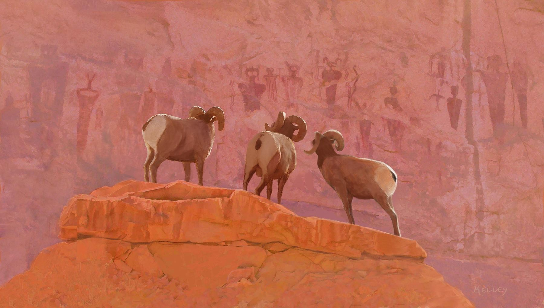 Description: Sheep On A Rock is an 24 x 36 original acrylic painting rendered in the traditional manner using acrylic pigments brushed on artist canvas. The work is a study of angles and curves. Intersecting planes of desert-varnished sandstone serve as background to the ram