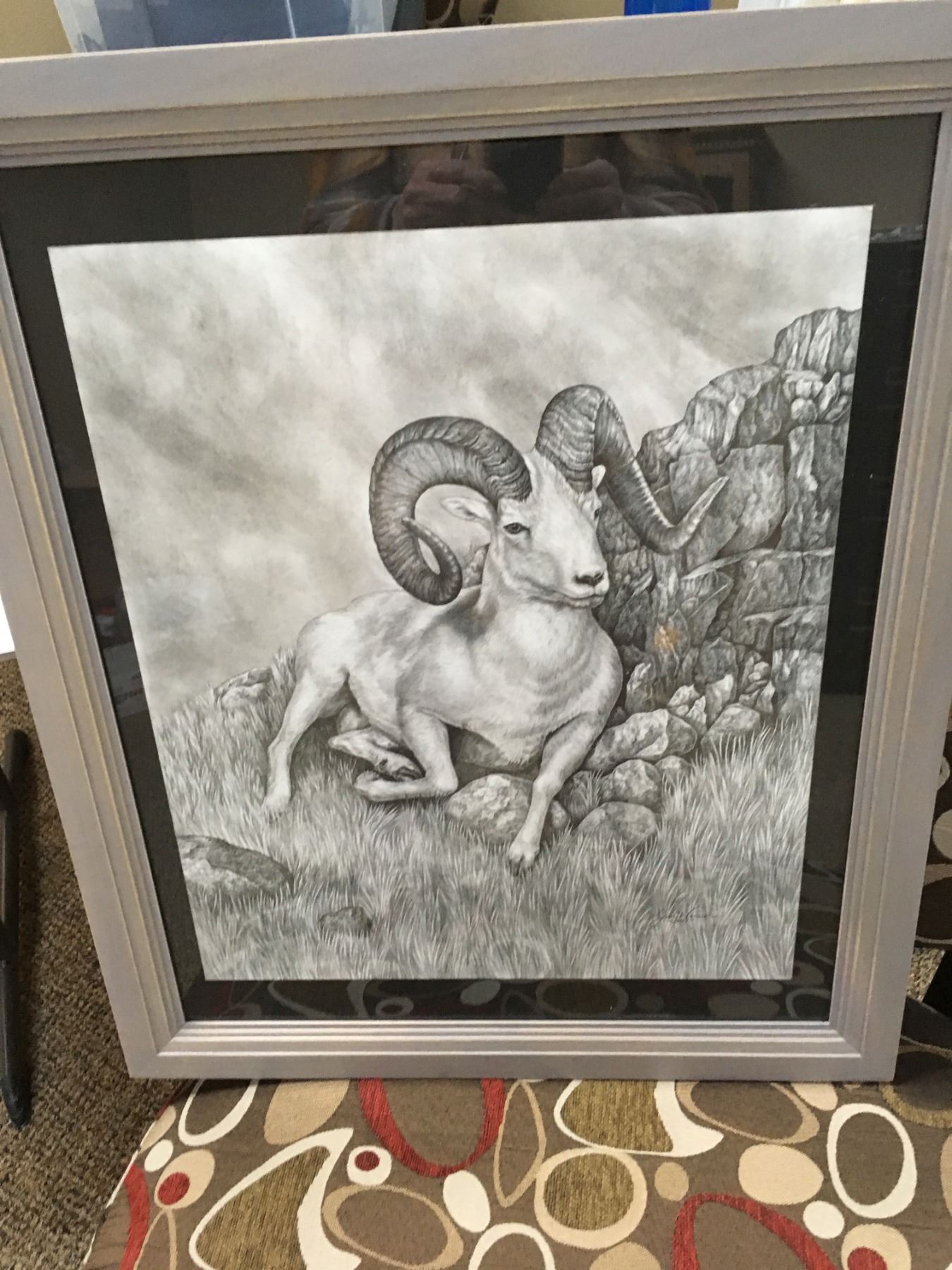 Description: This is an original 14” x 17” drawing of a Dall’s ram entitled “In All His Glory. Jim Weaver has been drawing since he could hold a pencil. He’s always enjoyed the unique values of using the black and white medium. He feels it hold a timeless and classic feel. Jim’s desire is to learn and grow in his craft and quality with every piece he creates.