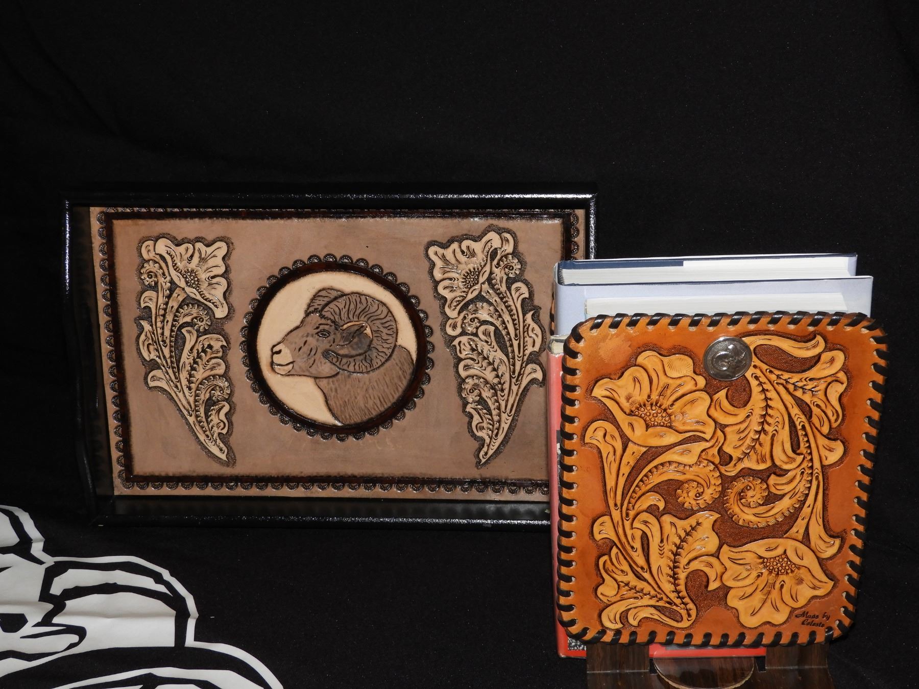 Lot 58 Wooden Serving Tray with Custom Hand Tooled Leather Big Horn Sheep Inlays and Leather Tooled Bookend