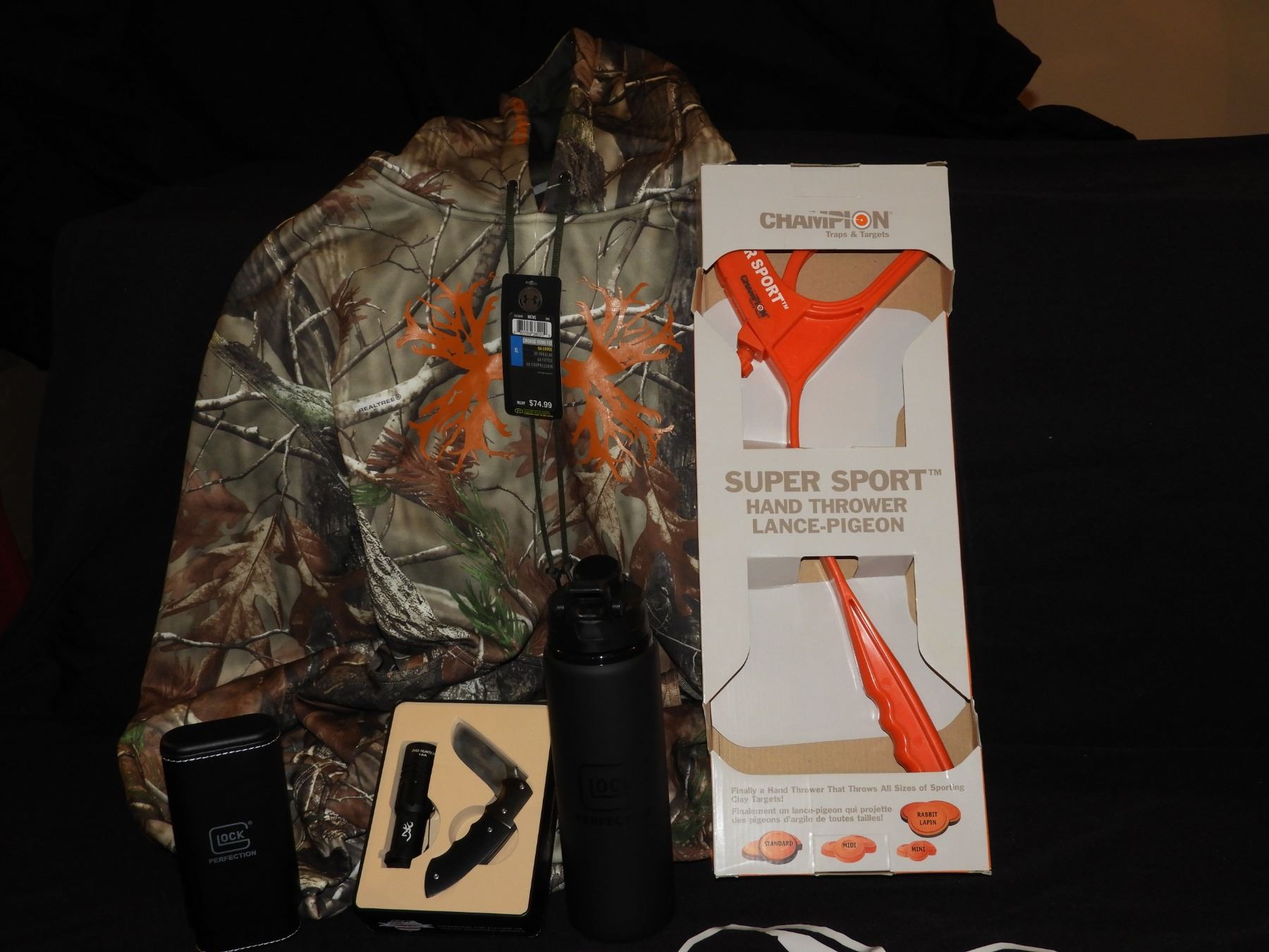 Front pocket with right-side internal phone pocket. Glock cigar box and mug, Browning Knife & Lite Set and a claybird hand thrower