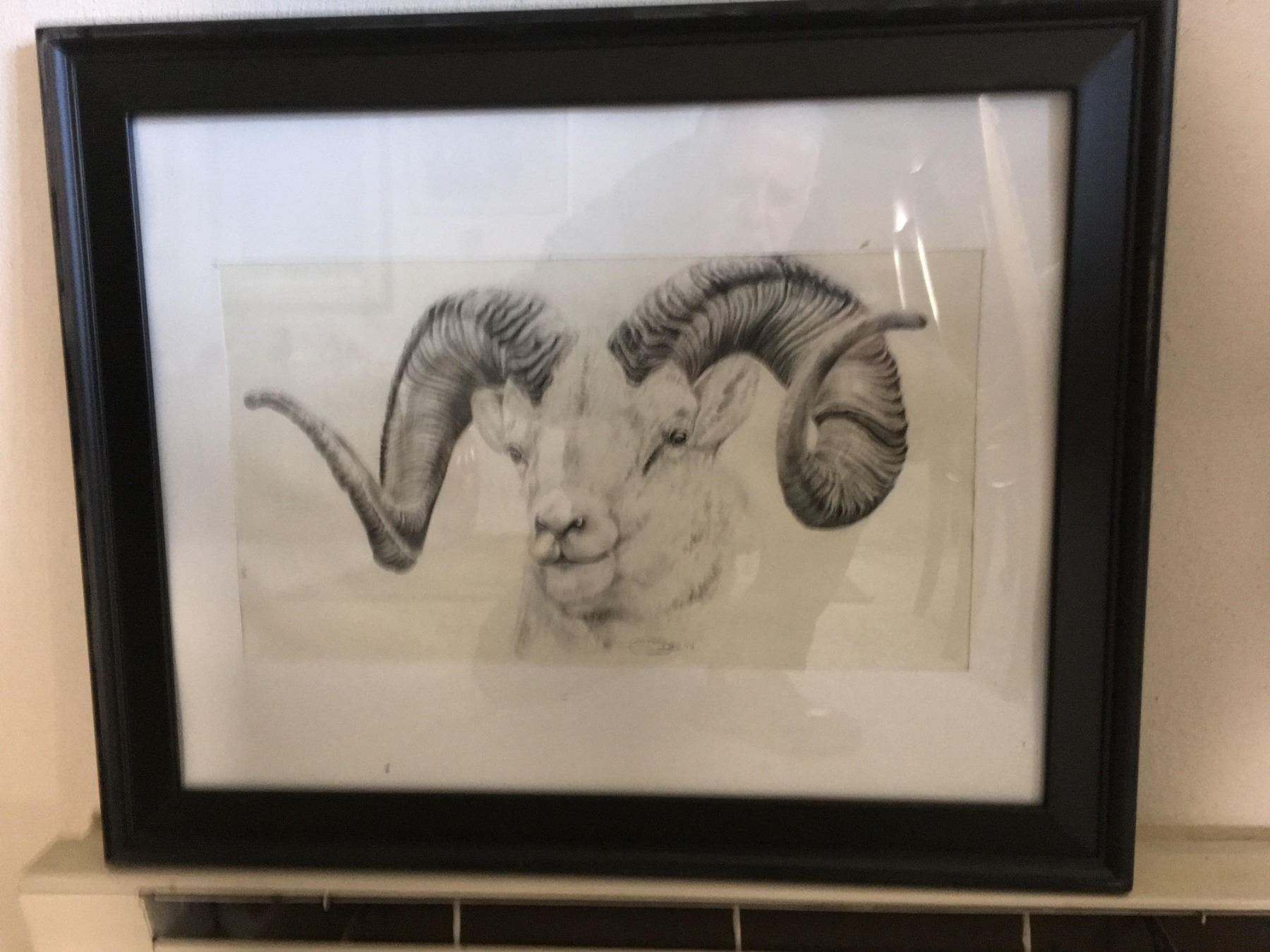Description: "Dall Sheep"-pencil sketch by Nicole Reynolds in a temporary frame. Aprox 9x15