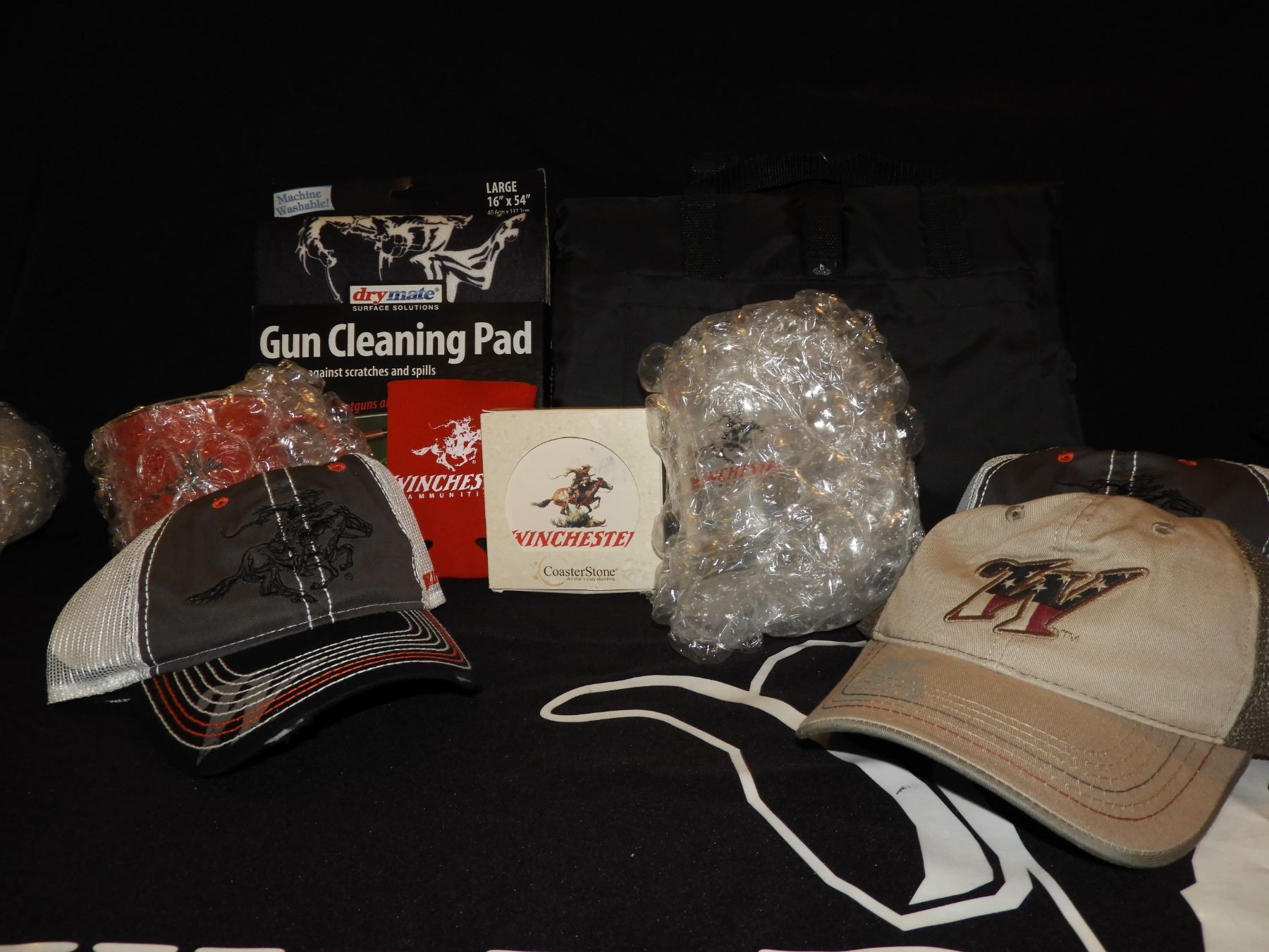 Description: Winchester coasters, 2 beer mugs,3hats, gun cleaning pad, rec pack, 8 coozies, and a coffee mug