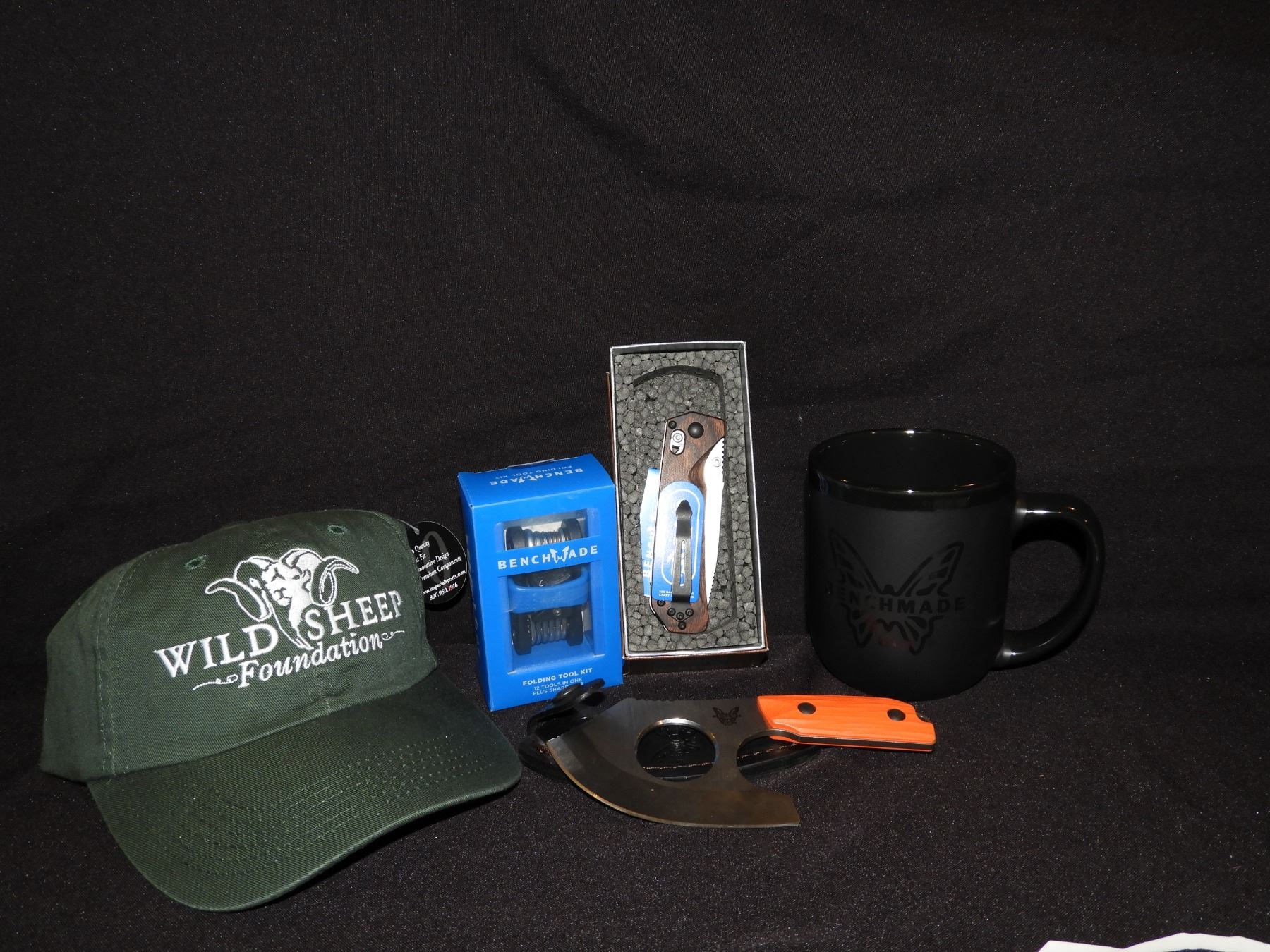Description: Benchmade tool kit, knive, skinner coffee mug, and WSF hat