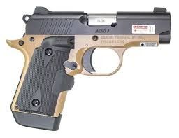 Description: Complete with a prominent black slide, tan frame finish and Crimson Trace Lasergrips, the Micro 9 Desert Night (LG) has a smooth trigger pull, mild recoil and the intuitive operation of a 1911.
