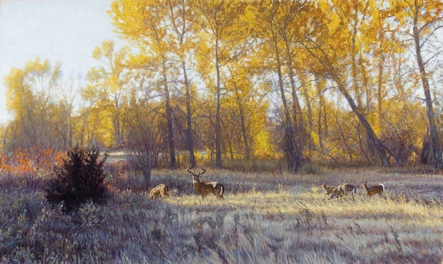 This 24” x 40” Giclee is a magnificent addition to any art collection, wherein, a magnificent buck and his does are making their way along the river, flanked by the golden fall trees in the background. The artist describes his work in the following way: “Whitetail Deer have always been part of the Montana landscape, but the sight of a buck in an Autumn setting is pure gold. This herd of Whitetail Deer was on the banks of the Big Hole River in a spectacular forest of cotton woods and willows, just south of the picturesque Meriwether Ranch. The Big Hole is a world-class trout stream that has some of the most scenic river-bottom landscapes in Montana.”- John Banovich John Banovich is the most respected and award-winning animal artist in the world and with Safari Club International. We thank him for this great donation. www.johnbanovich.com