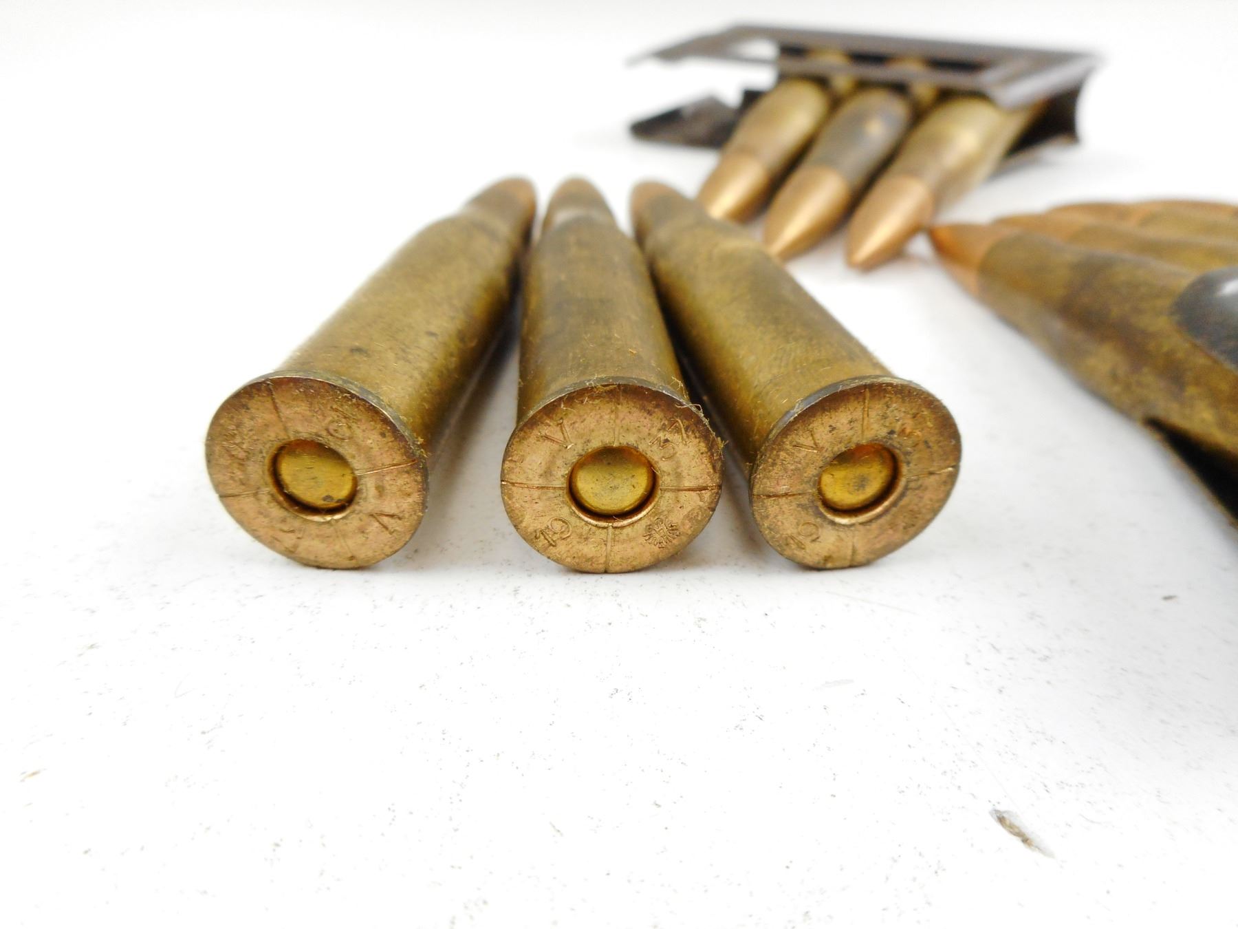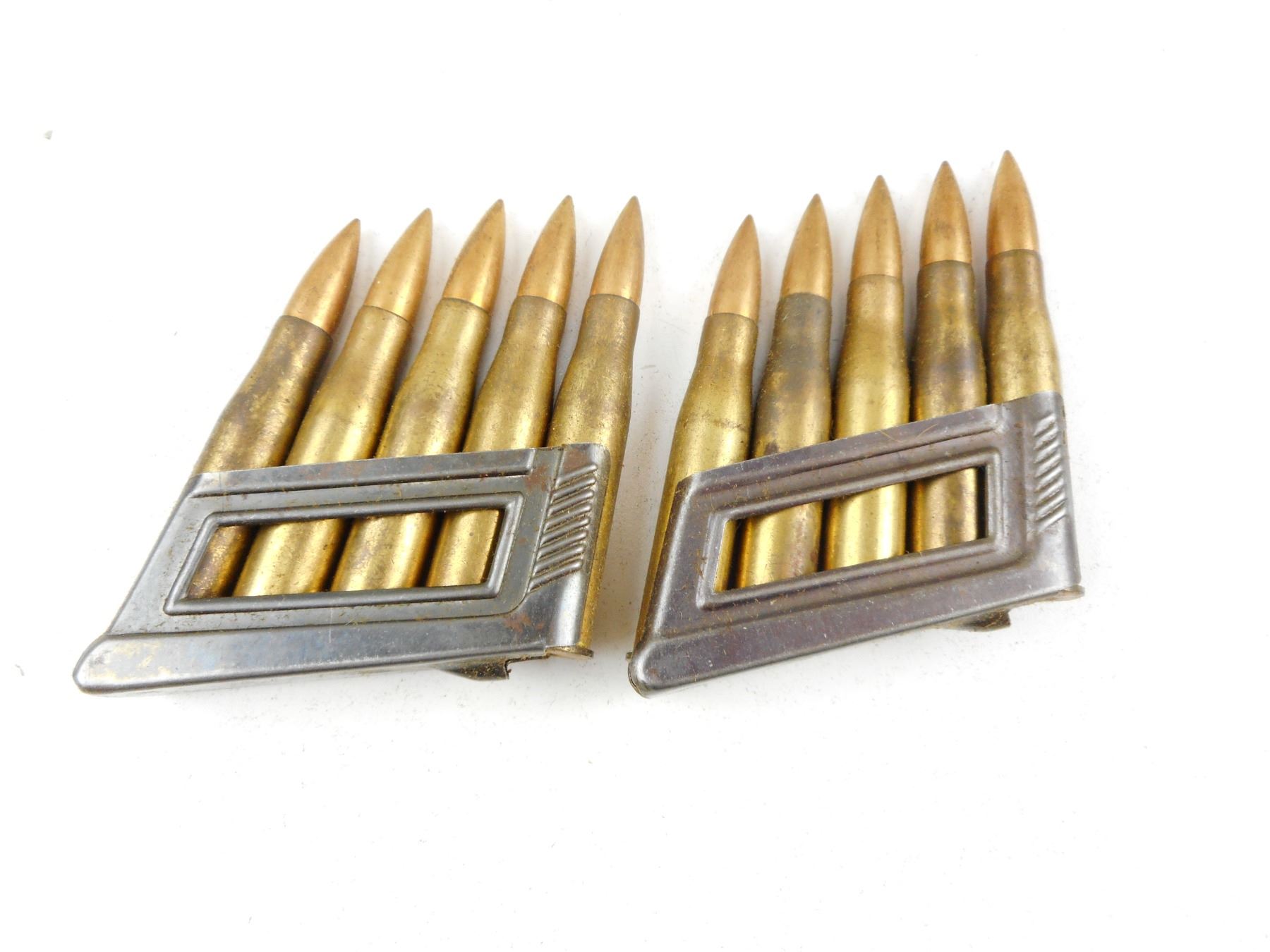 1938 DATED GERMAN STAMPED AMMUNITION FOR AUSTRIAN M95MANNLICHER SERVICE RIFLE, 8MM, STEYR, ON ORIGINAL 5 ROUND STIPPER CLIPS , 10 RNDS 1938 DATED GERMAN STAMPED AMMUNITION FOR AUSTRIAN M95 MANNLICHER SERVICE RIFLE 8MM STEYR, ON ORIGINAL 5 RND STRIPPER CLIPS