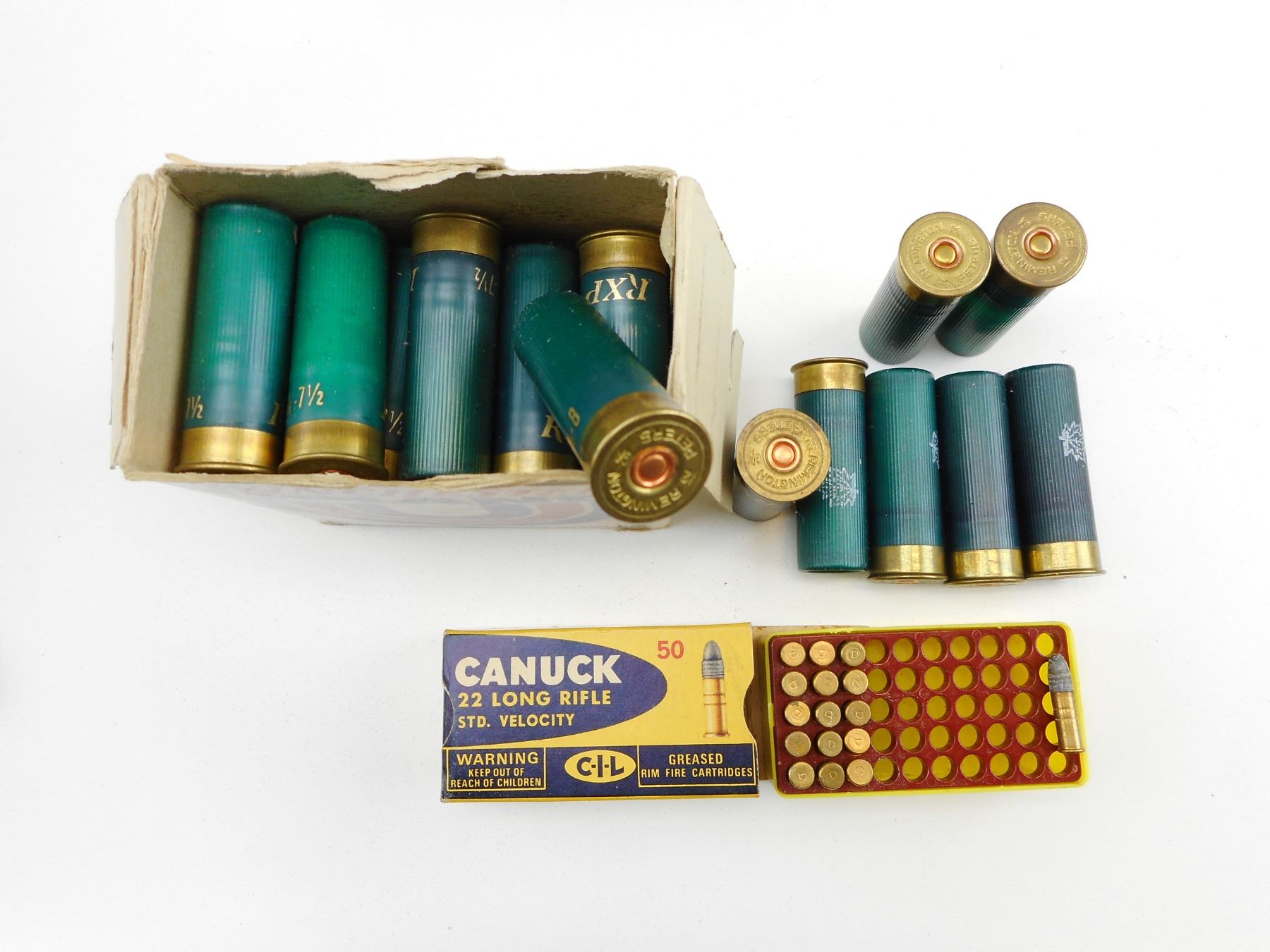 REMINGTON 12 GA. ALL-AMERICAN TARGET #9 AMMO, PETERS 12 GAUGE REMINGTON AMMO, CIL CANUCK 22 LONG RIFLE AMMO , 6 RNDS REMINGTON PLASTIC PISTON POWER LOAD, 12 GA. 2 3/4" #9 AMMO, IN VINTAGE REMINGTON BOX, 21 RNDS 12 GA. 2 3/4" AMMO IN VINTAGE WINCHESTER BOX, 16 RNDS CIL CANUCK 22 LONG RIFLE AMMO IN VINTAGE CIL BOX.
