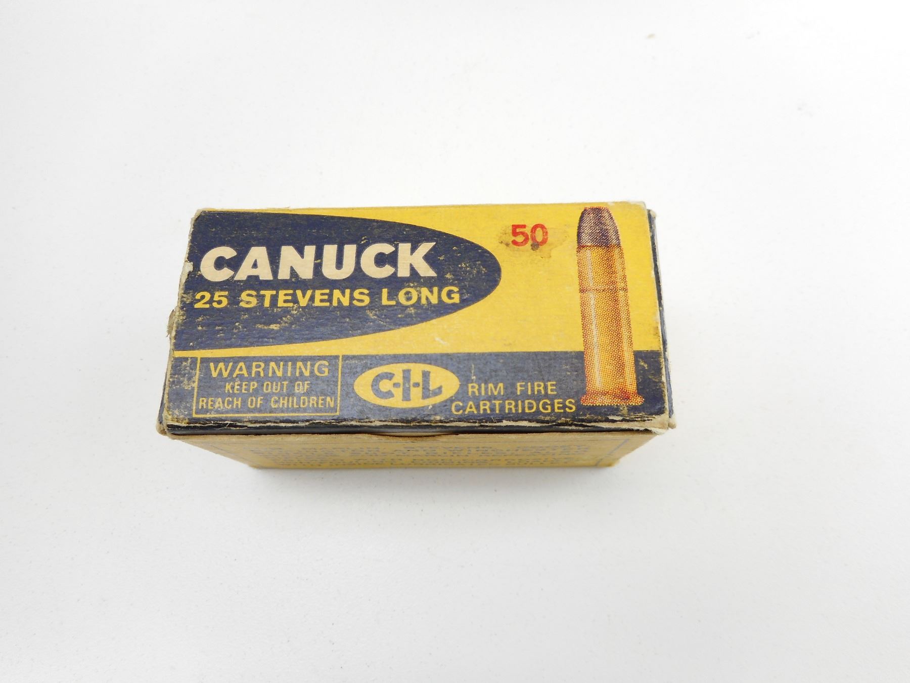 Lot 1849 ASSORTED 25 STEVENS LONG AMMO IN CIL CANUCK VINTAGE BOX
