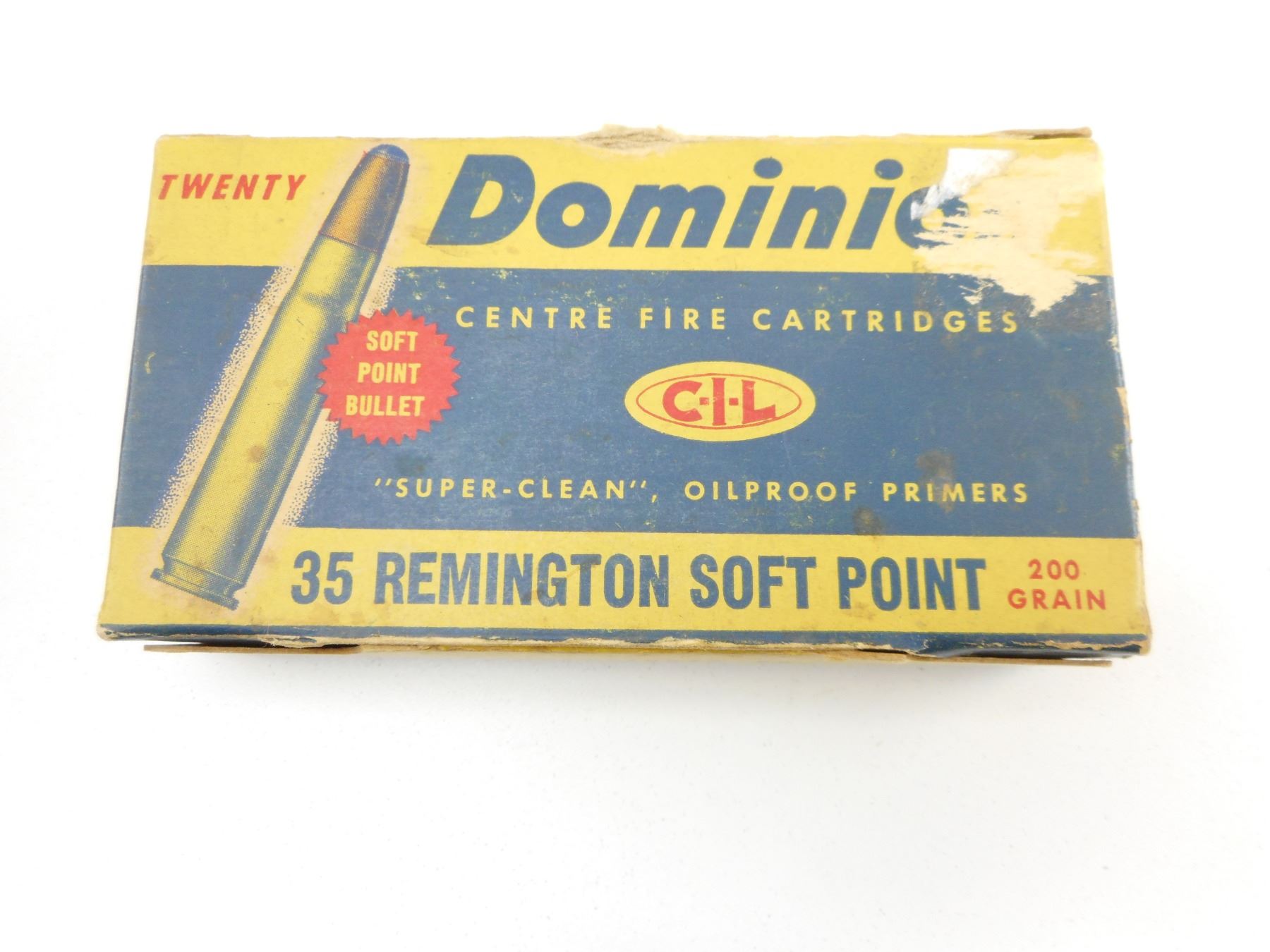 DOMINION 35 REMINGTON SOFT POINT , 20 RNDS DOMINION 35 REMININGTON SP AMMO IN VINTAGE DOMINION BOX