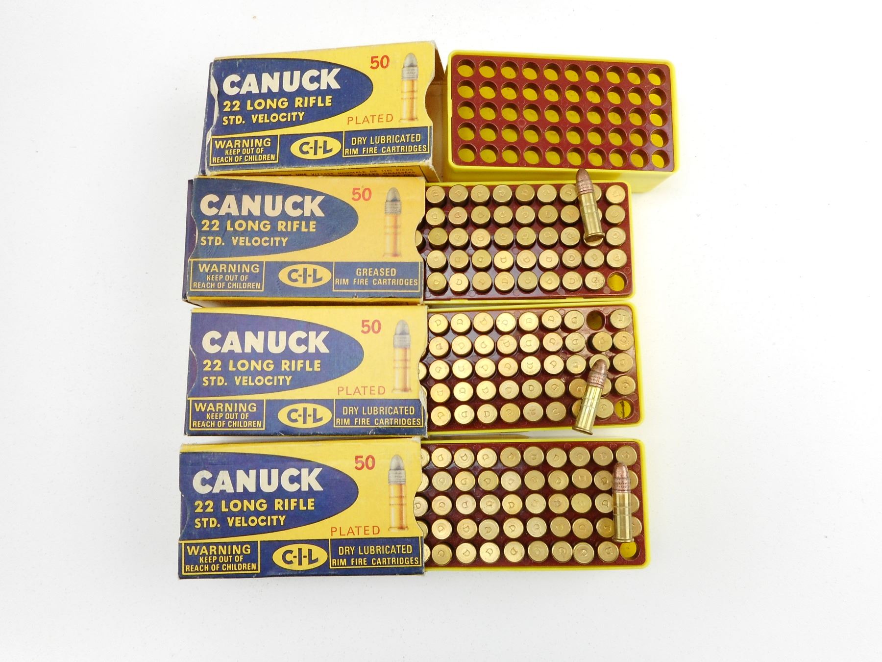CANUCK 22 LONG RIFLE AMMO IN VINTAGE CIL BOXES , 149 RNDS 22 LONG RIFLE AMMO IN VINTAGE CIL BOXES, ONE EMPTY VINTAGE CIL CANUCK AMMO BOX