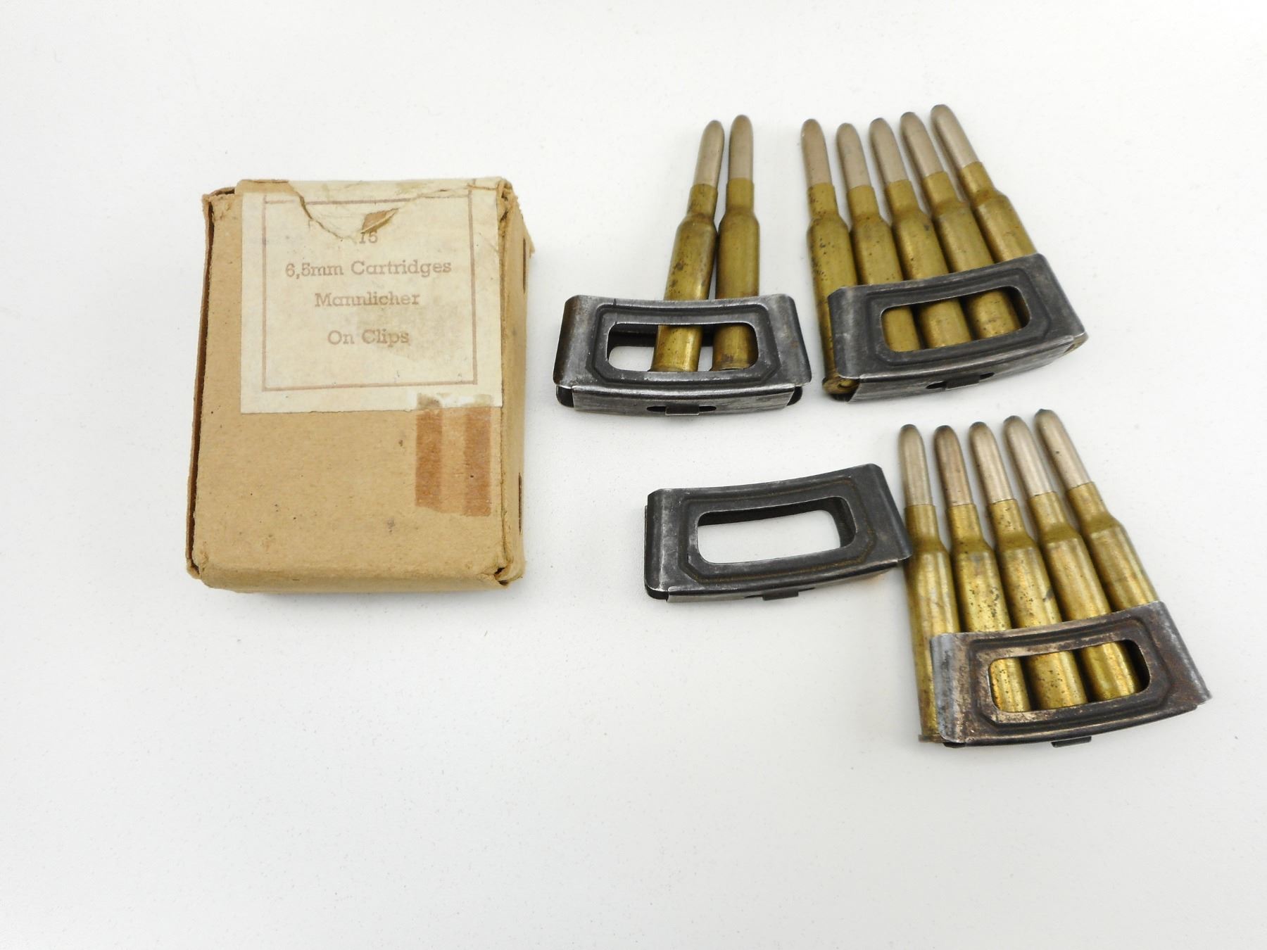 6.5MM AMMO ASSORTED ON STRIPPER CLIPS , 27 RNDS 6.5MM AMMO ON STRIPPER CLIPS, ONE EMPTY STRIPPER CLIP, 6.5MM MS AND 6.5MM MS RIMED FOR DUTCH, GREEK ROUMANIAN RIFLES