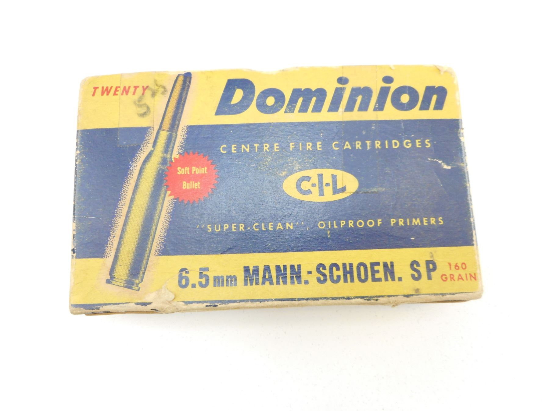 6.5MM MANN.-SCHOEN. SP AMMO , 20 RNDS 6.5MM MANN. - SCHOEN. SP AMMO, IN VINTAGE DOMINION BOX