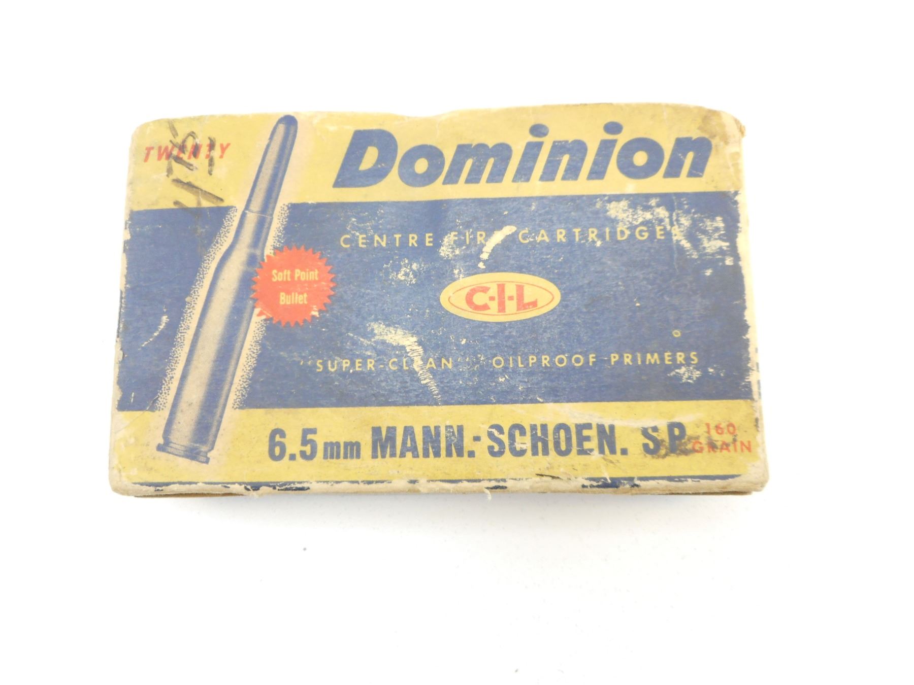 6.5MM MANN.-SCHOEN. SP AMMO , 19 RNDS 6.5MM MANN.-SCHOEN. SP AMMO, IN VINTAGE DOMINION BOX