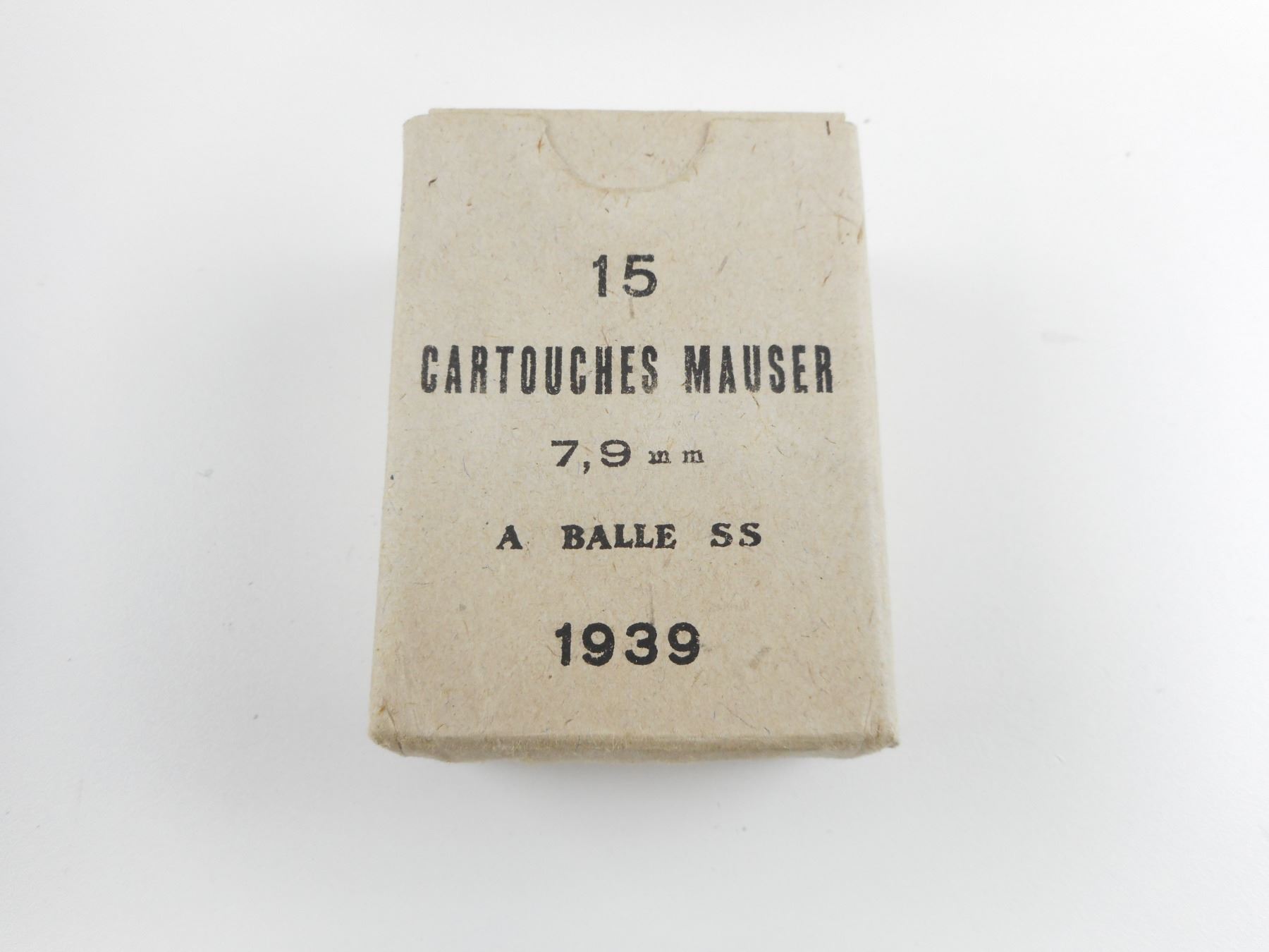 7.9MM MAUSER AMMO, STAMPED 1939 , 15 RNDS 7.9MM MAUSER AMMO, BOX STAMPED 1939