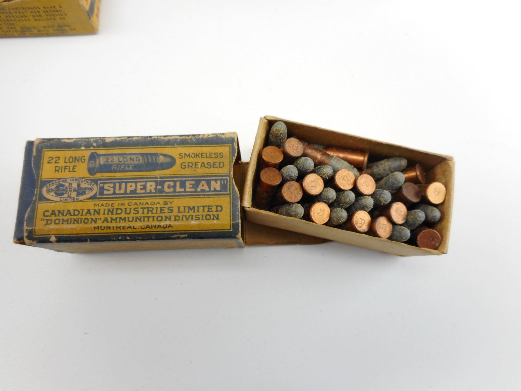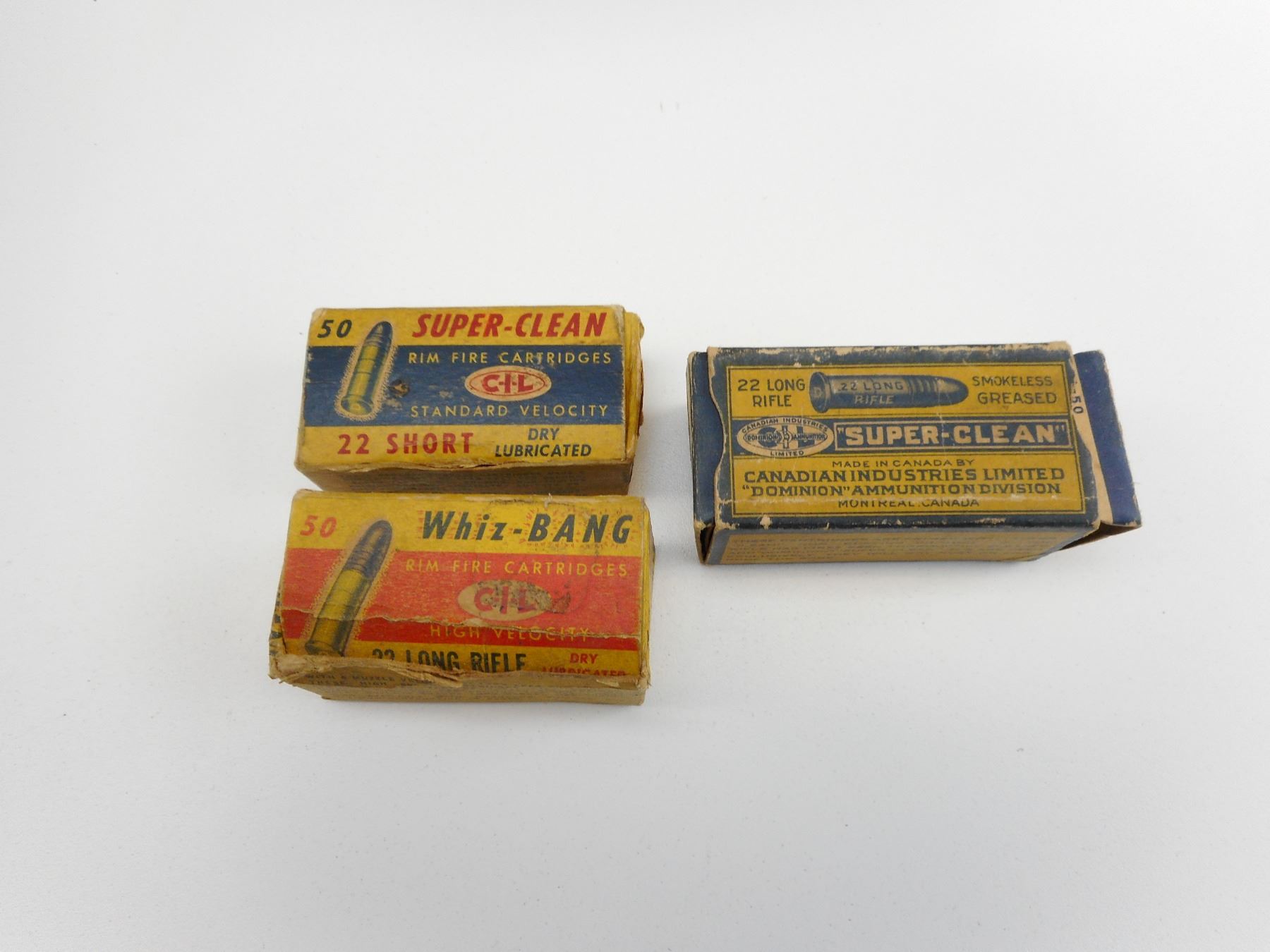 CIL 22 SHORT, & 22 LONG AMMO , 35 RNDS CIL 22 LONG RIFLE, IN VINTAGE CIL BOX, 14 RNDS 22 SHORT IN VINTAGE CIL BOX, EMPTY CIL WHIZ-BANG 22 LONG RIFLE AMMO BOX