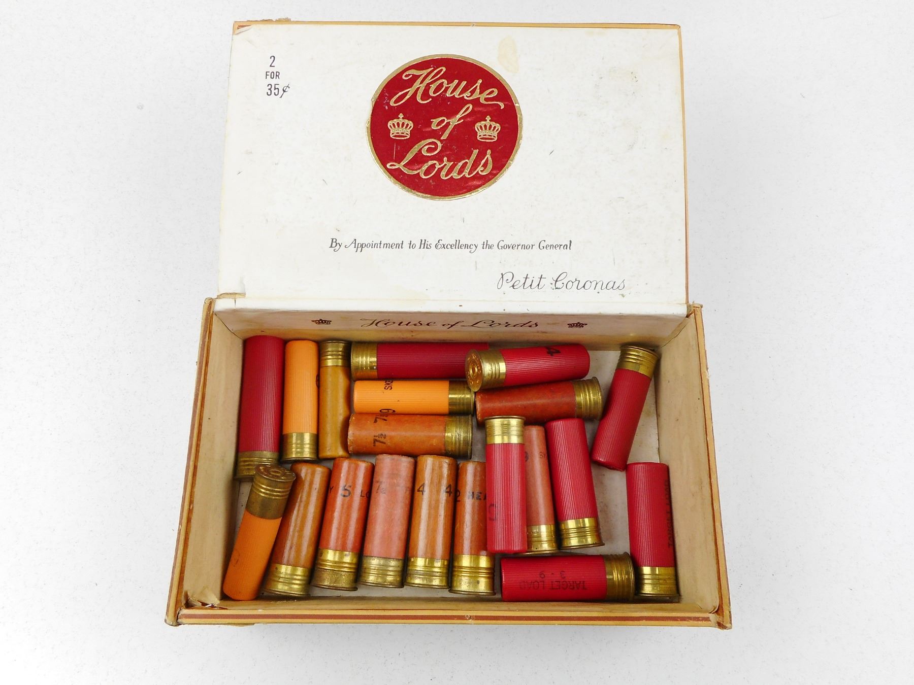 ASSORTED SHOTGUN SHELLS, 12 GA, 20 GA. 16 GA. AND 18 GA. , 18 SHOTGUN SHELLS ASSORTED SIZES, 12 GAUGE, 20 GAUGE, 16 GAUGE, AND 18 GAUGE IN VINTAGE HOUSE OF LORDS CIGAR BOX