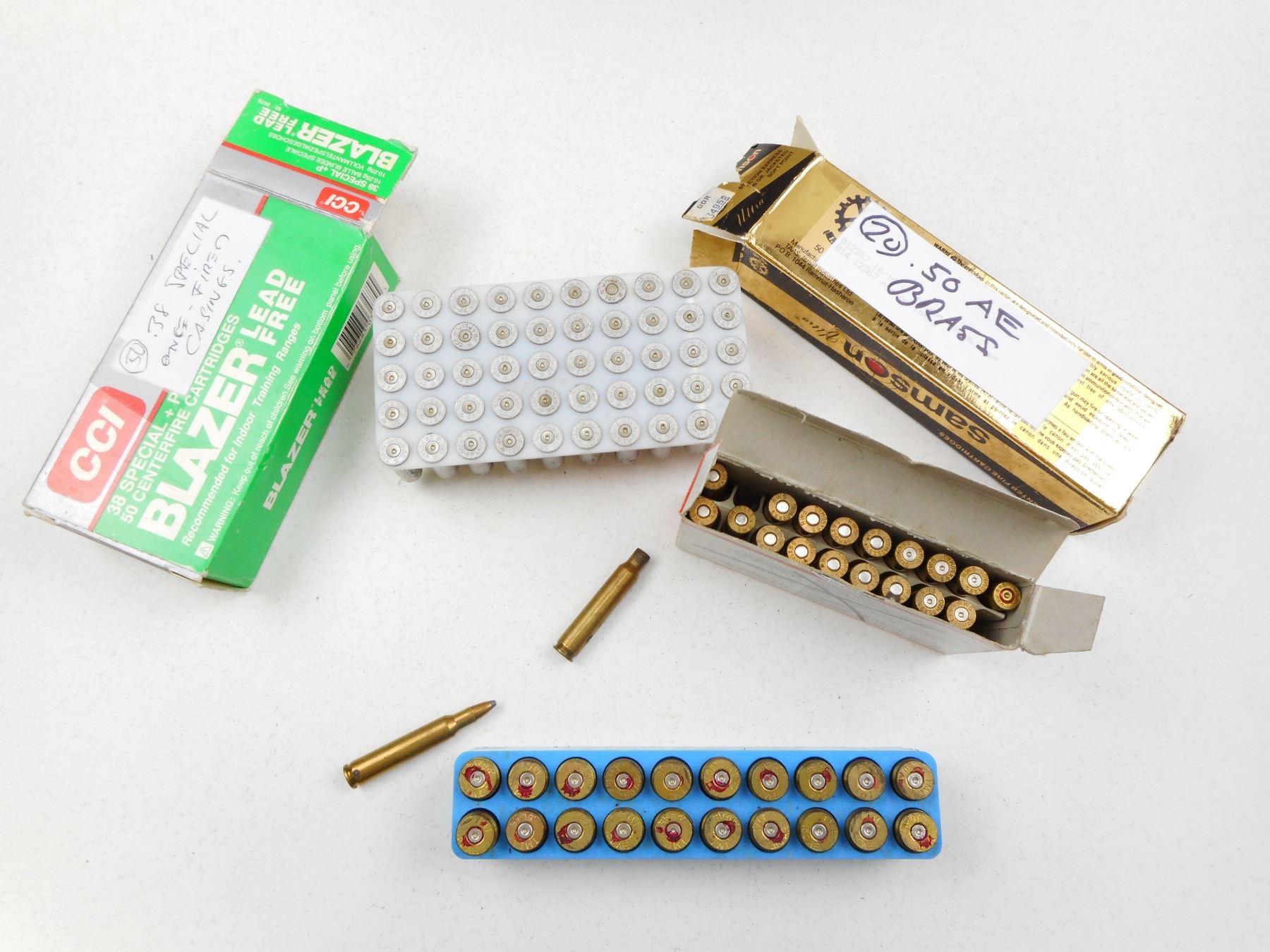 RWS 5.6 X 50 MAG AMMO & BRASS, CCI 38 SPL ONCE FIRED CASES, IMI 50 ACTION EXRESS BRASS , 13 RNDS 7 BRASS, RWS 5.6 X 50 MAG, 50 PIECES ALUMINUM IN BOX 38 SPL, 20 PCS IMI 50 ACTION EXPRESS BRASS