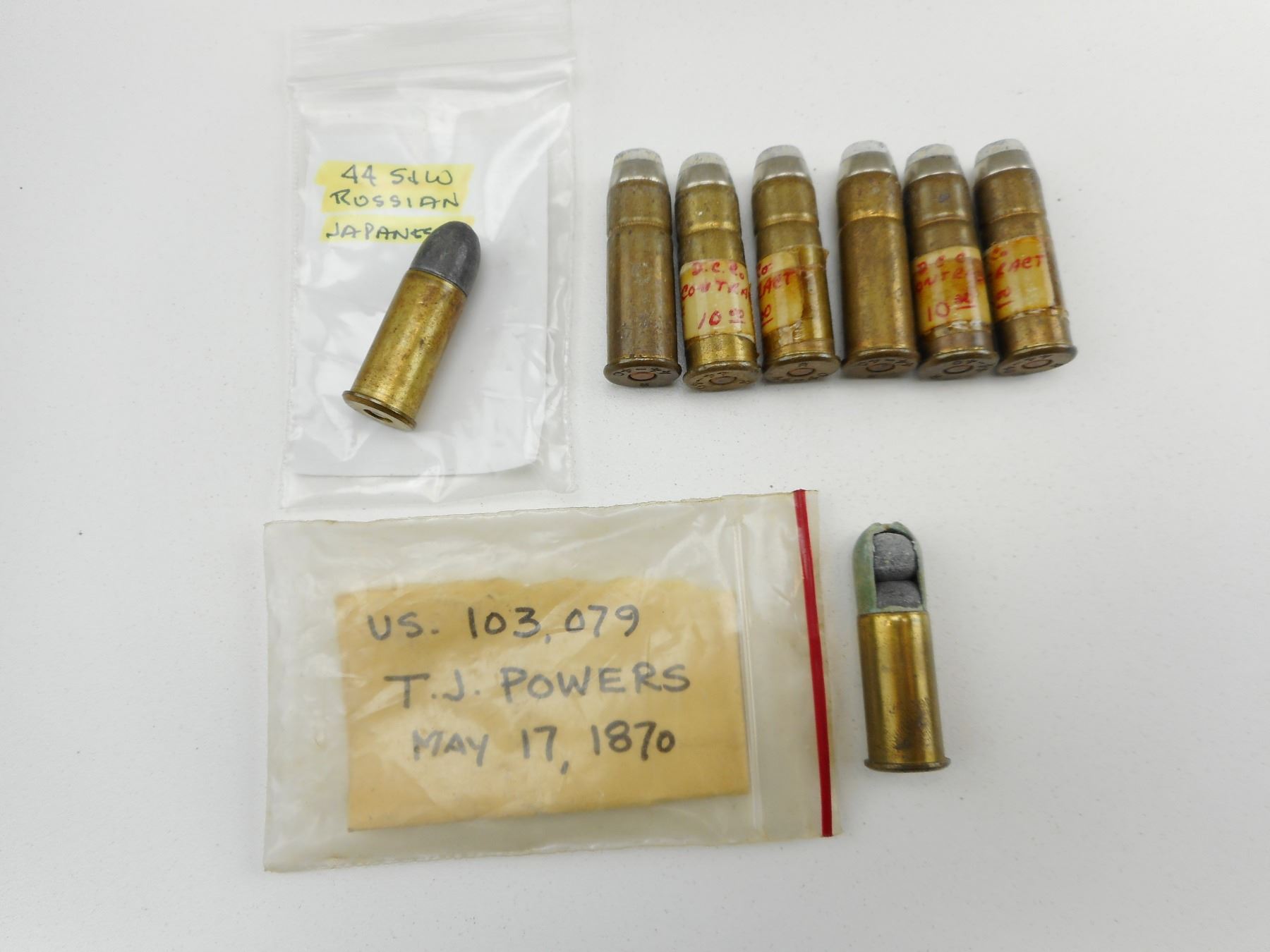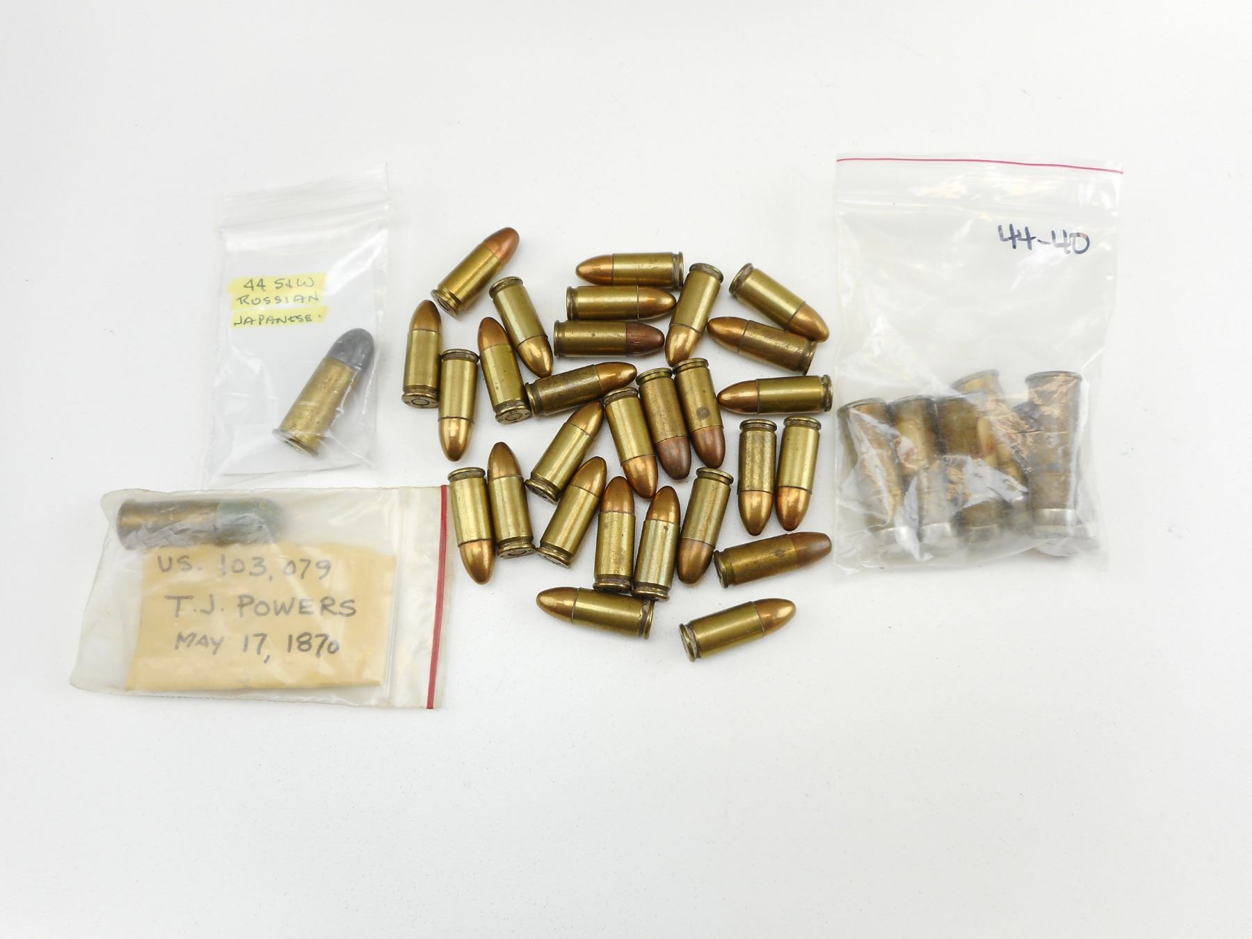 44 S & W RUSSIAN JAPANESE AMMO, 44 CAL. RUSSIAN AMMO, 9MM AMMO, 44-40 AMMO , 1 RND 44 S & W RUSSIAN JAPENESE AMMO, 1 RND 44 CAL. RUSSIAN AMMO, 28 RNDS 9MM AMMO, 6 RNDS 44-40 AMMO