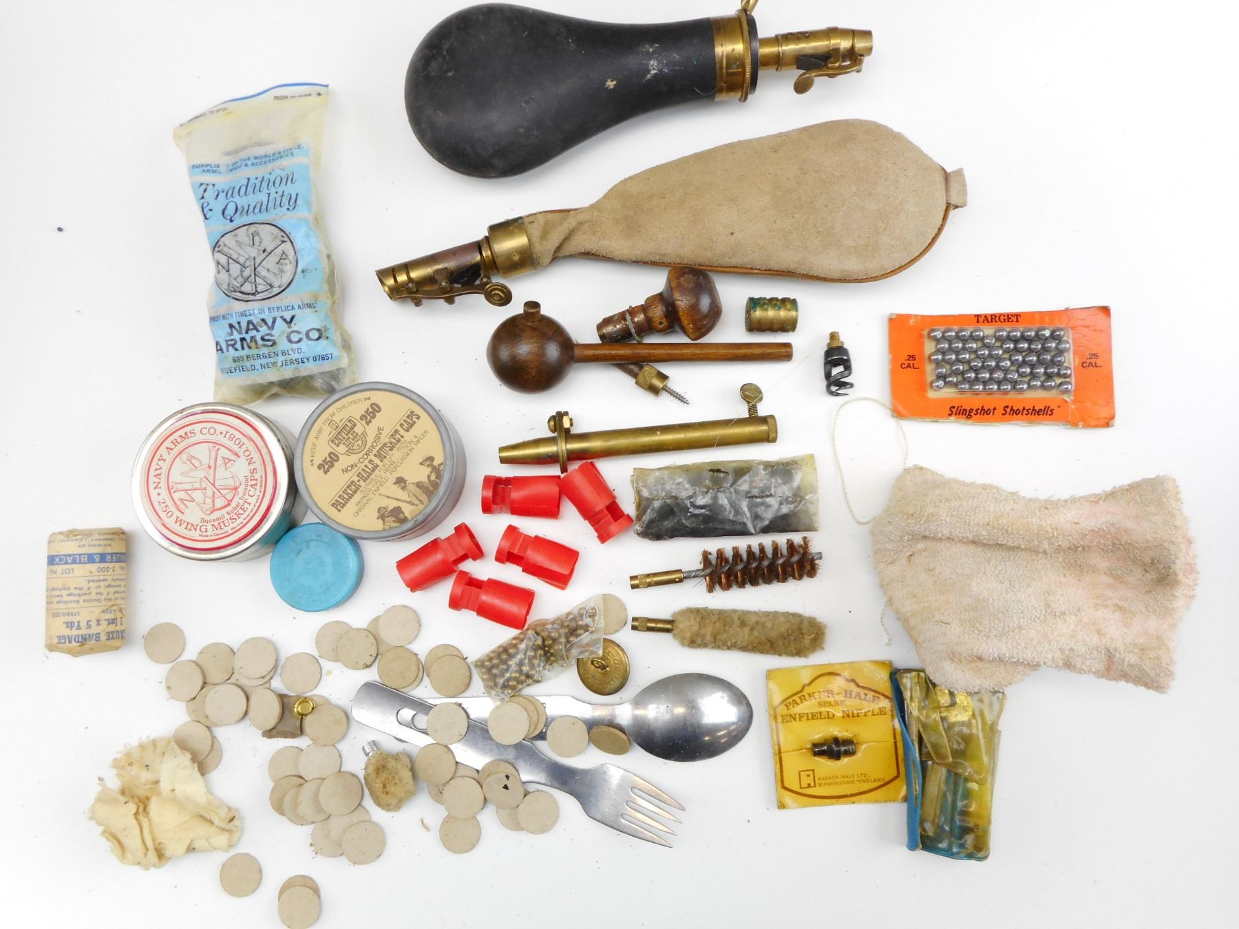 Lot 2060 1942 POSSIBILITIES LEATHER BAG INCLUDING BULLETS, LEAD BALLS, ASSORTED PERCUSSION CAPS, MEASURING TO