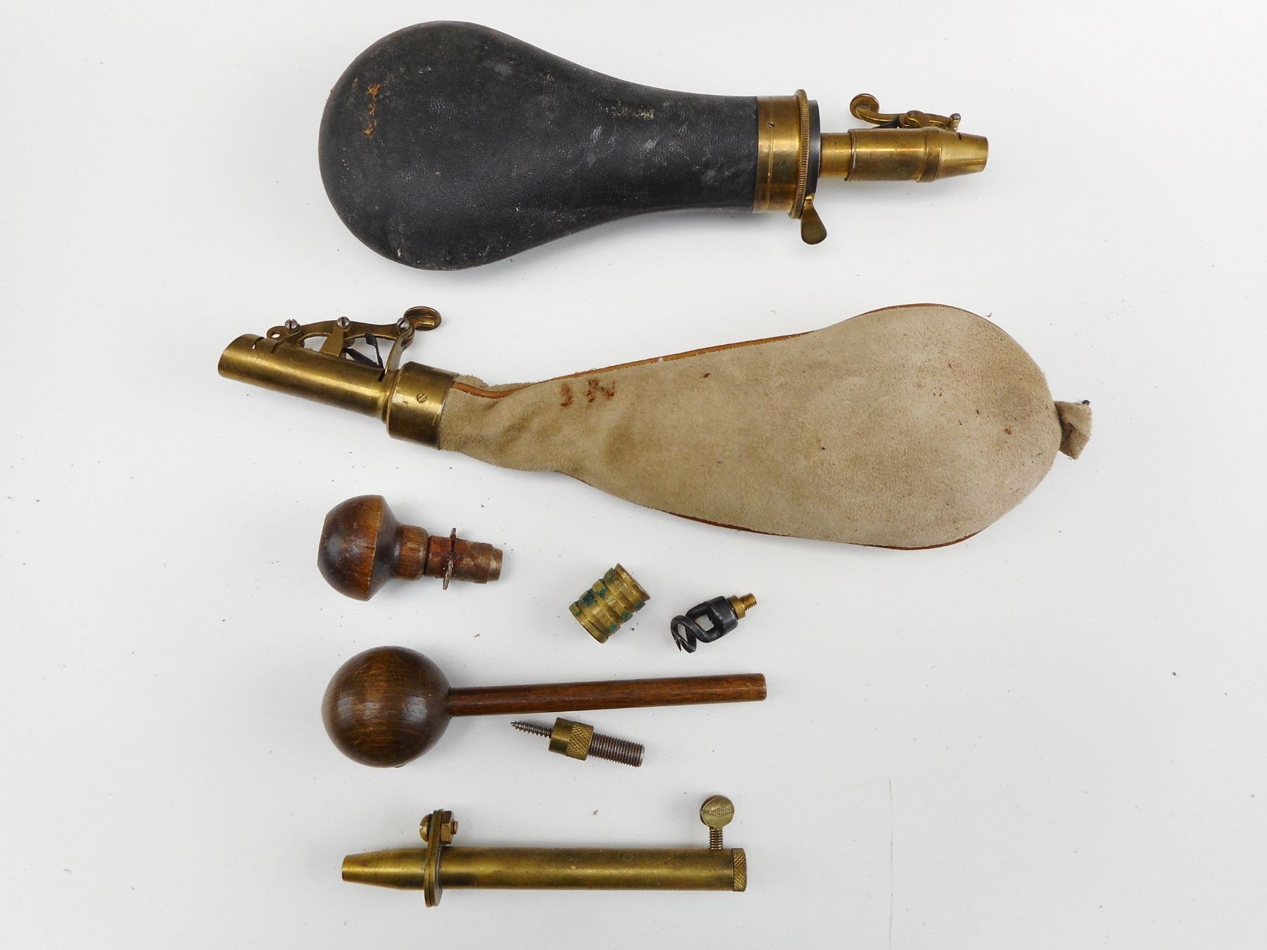 1942 POSSIBILITIES LEATHER BAG INCLUDING BULLETS, LEAD BALLS, ASSORTED PERCUSSION CAPS, MEASURING TOOLS, 2 BLACK POWDER MEASURES WITH BLACK POWDER. , LEATHER "1942" STAMPED BAG,INCLUDING BULLETS, LEAD BALLS, ASSORTED PERCUSSION CAPS, MEASURING TOOLS, 2 MEASURES WITH BLACK POWDER IN THEM.