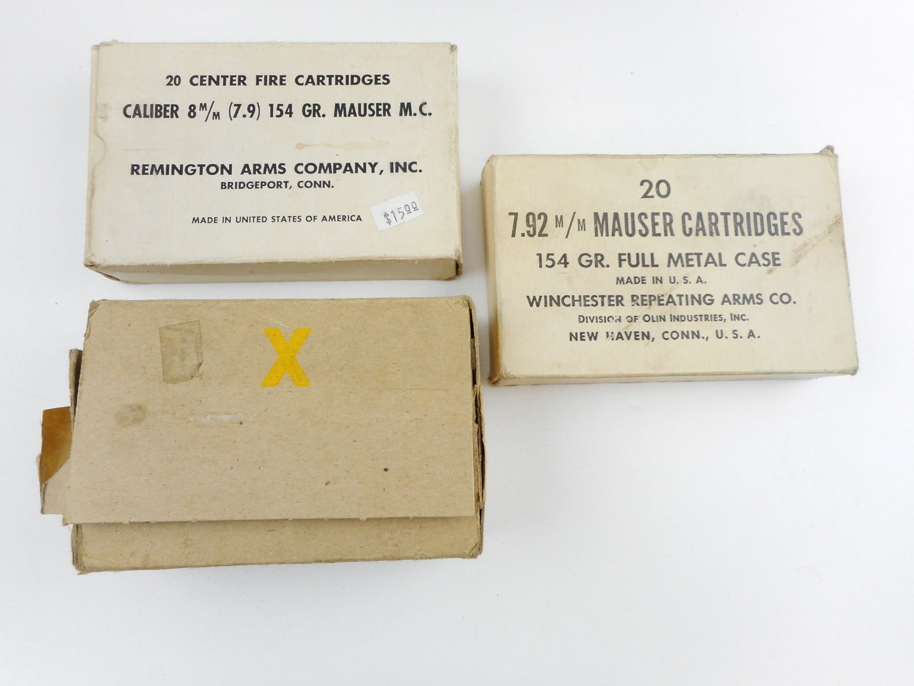 7.9MM ASSORTED AMMO , 70 RNDS 7.9MM ASSORTED AMMO, 12 - 7.9MM BRASS, BOX WITH YELLOW X IS CANADIAN WWII PRODUCTION 8MM MAUSER