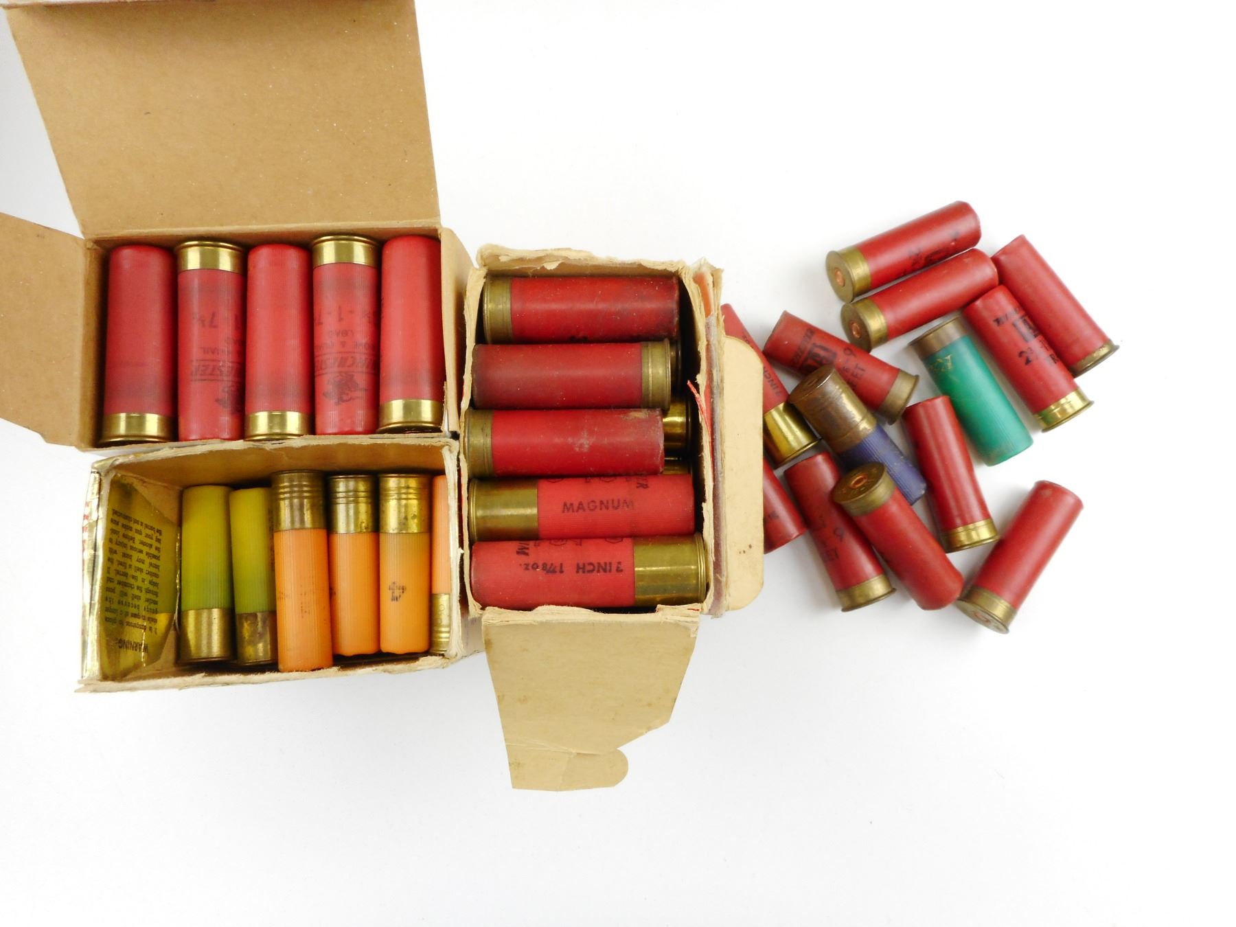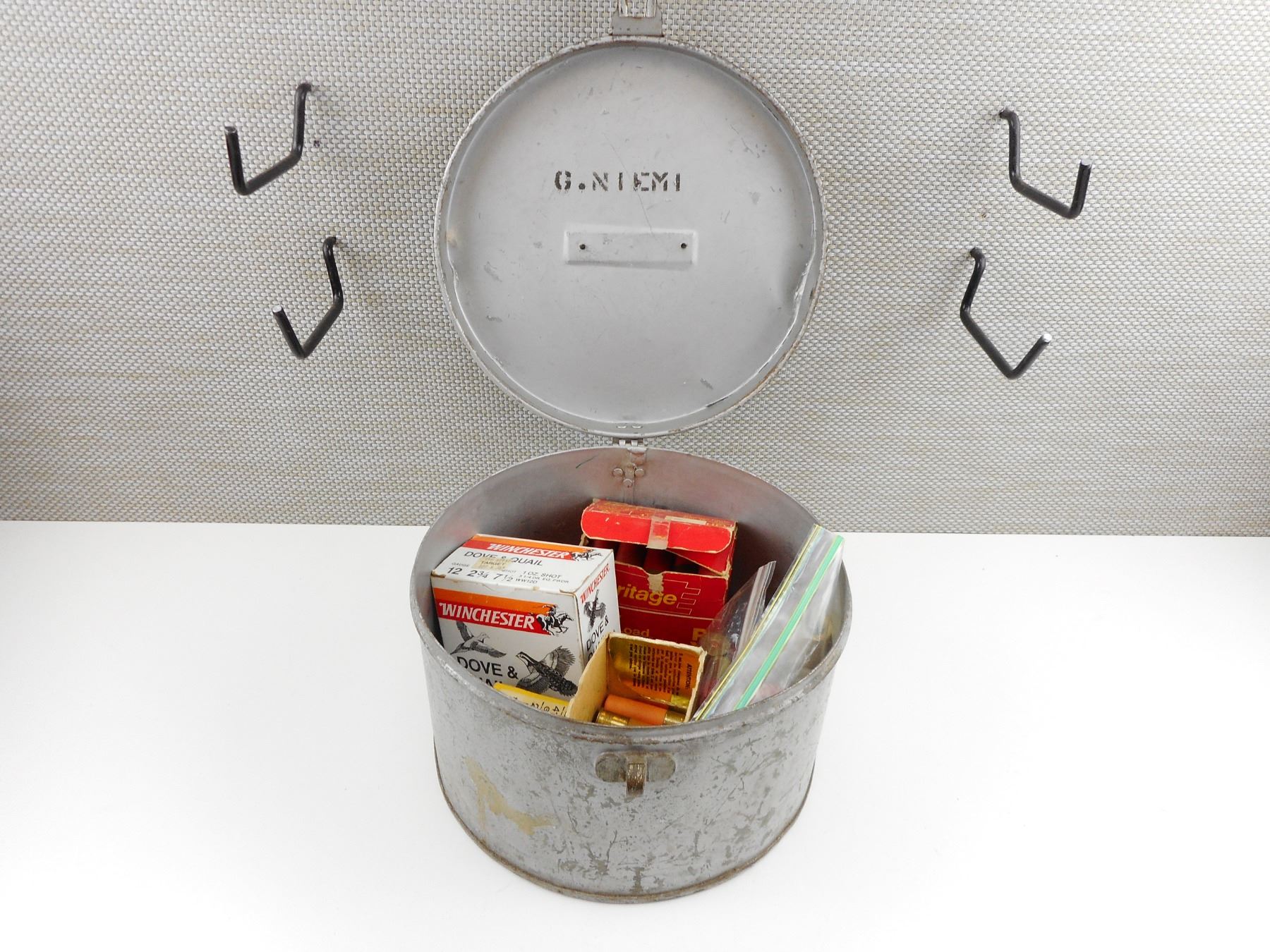 ASSORTED SHOT GUN SHELLS, IN ROUND METAL TIN , 16 RNDS 20 GAUGE ASSORTED SHOTS, 21 SHOTGUN SHELLS 410 GA. ASSORTED SHOTS, 28 RNDS 12 GAUGE SHOTGUN SHELLS ASSORTED SHOTS,25 SHELLS WINCHESTER DOVE & QUAIL SHOGUN SHELLS 12 GA. 2 3/4" 7 1/2 SHOT, 8 SHELLS 410 GA. 3" ASSORTED SHOTS, 13 SHELLS 12 GA. ASSORTED SHOTS, FLARE AMMO (SOME MAY HAVE GERMAN ORIGIN, ONE IS EMPTY. TIN APPROX. SIZE - 10.5" WIDE X 7" HIGH, ROUND TIN IS WWII ROYAL CANADIAN NAVY ISSUE HAT BOX FOR STORAGE OF EXTRA CAPS - WHITE CANVAS TOP "PORT AND STARBOARD" OR BLACK WOOL PUSSER