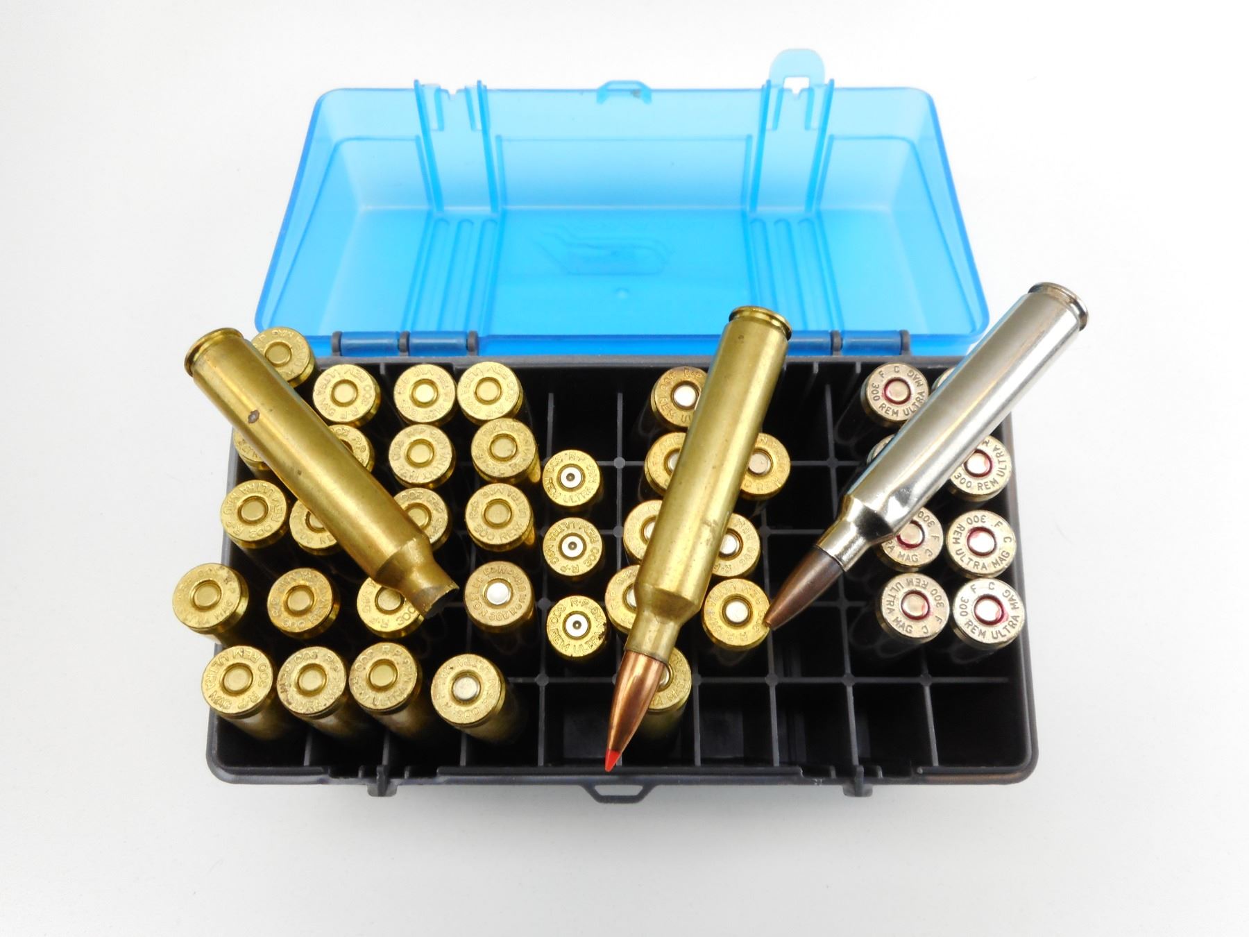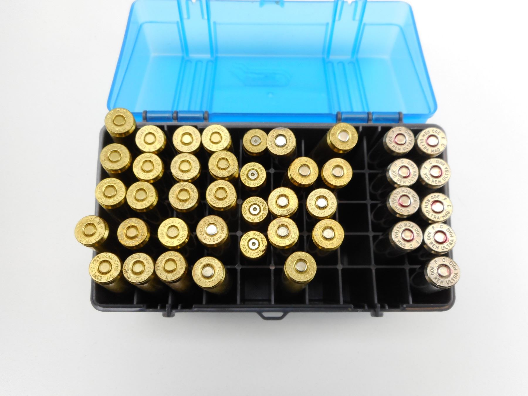300 REM ULTRA MAG ASSORTED AMMO , 38 RNDS 300 REM ULTRA MAG AMMO ASSORTED, 4 BRASS, IN HARD PLASTIC CASE