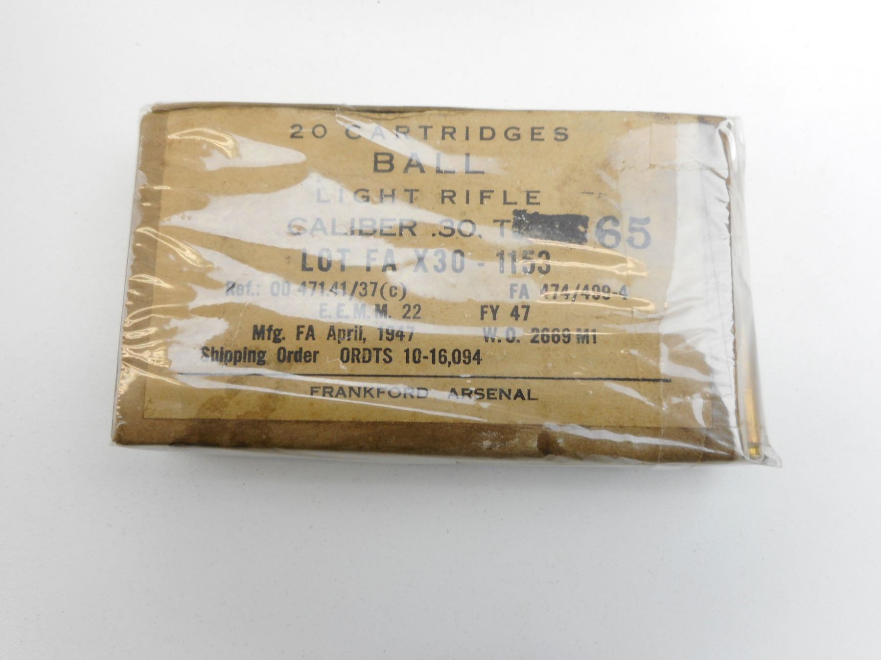 .30 CALIBER LIGHT RIFLE AMMO , 1 RND .30 CALIBER LIGHT RIFLE, DATED 1947, FRANKFORD ARSENAL IN VINTAGE BOX, SEALED