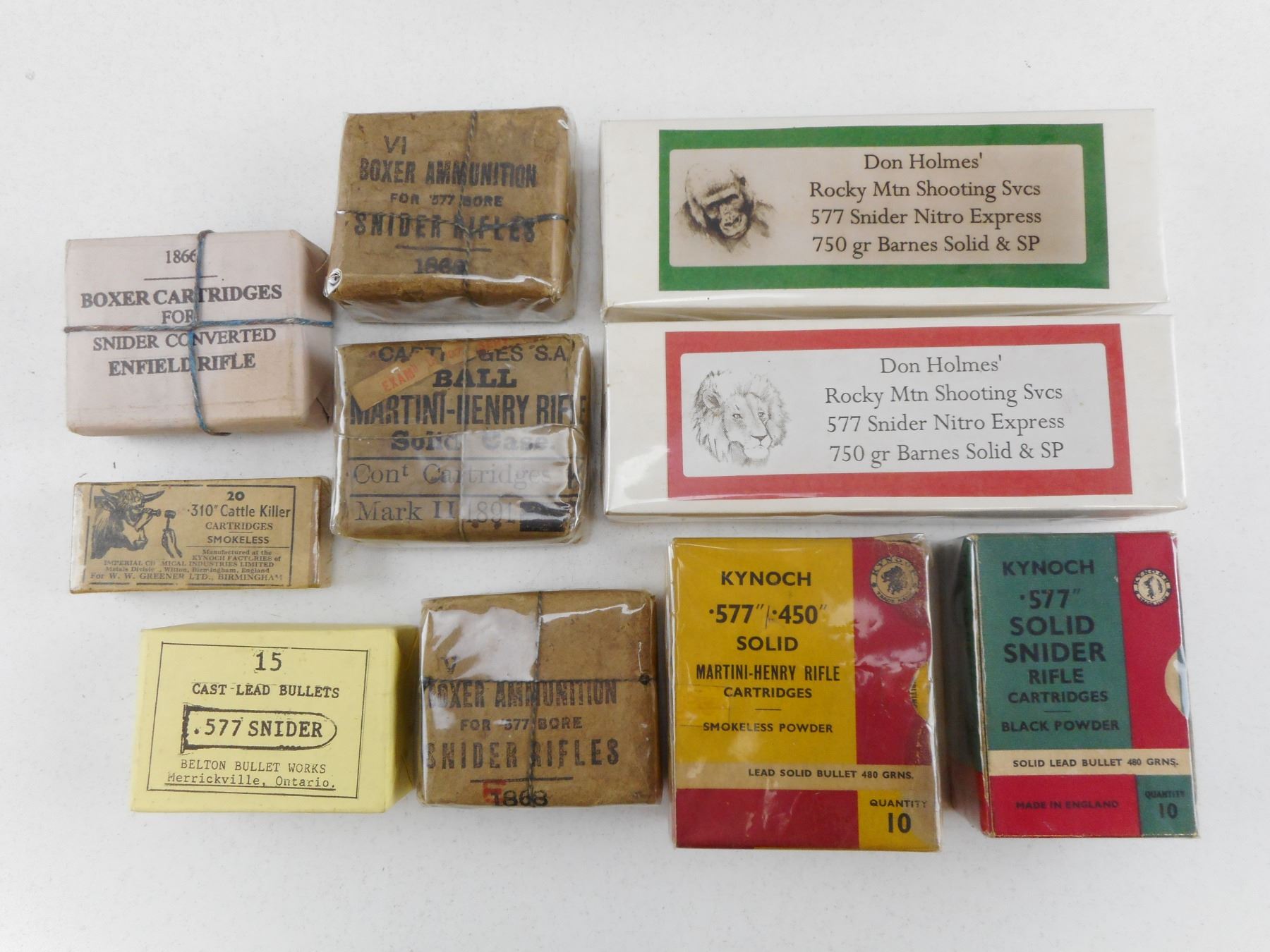 10 COLLECTOR AMMO BOXES, DATED FROM 1867-1886 , KYNOCH .577 SNIDER COLLECTOR BOX, BOXER AMMUNITION BOX, DON HOLMES ROCKY MTN SHOOTING SVS, .310 CATTLE KILLER BOX, KYNOCH .577/.450 MARTINI-HENRY BOX, CARTRIDGES S.A. BALL MARTINI-HENRY RIFLE BOX, BELTON BULLET WORKS
