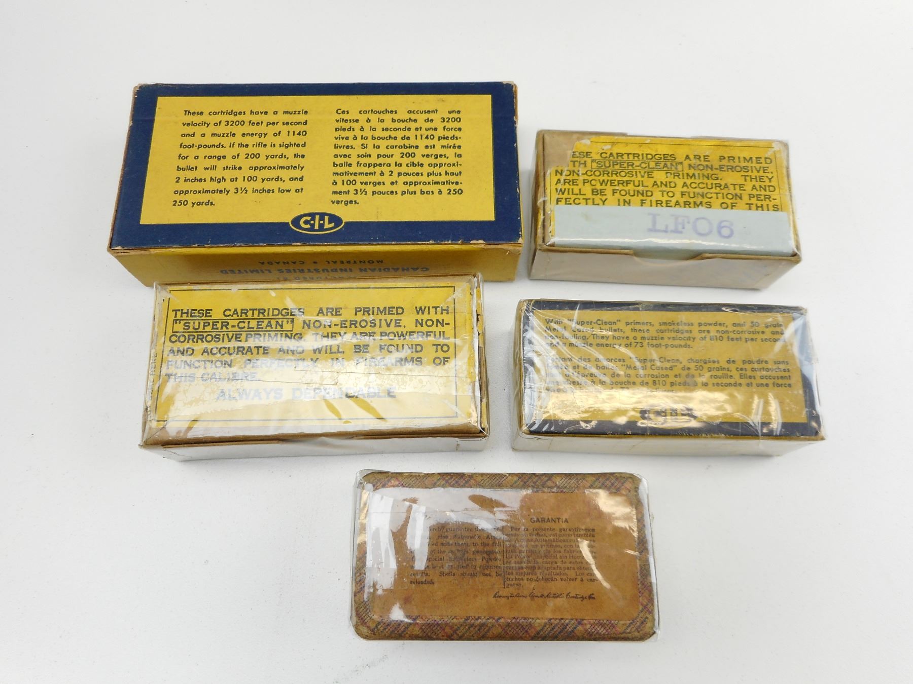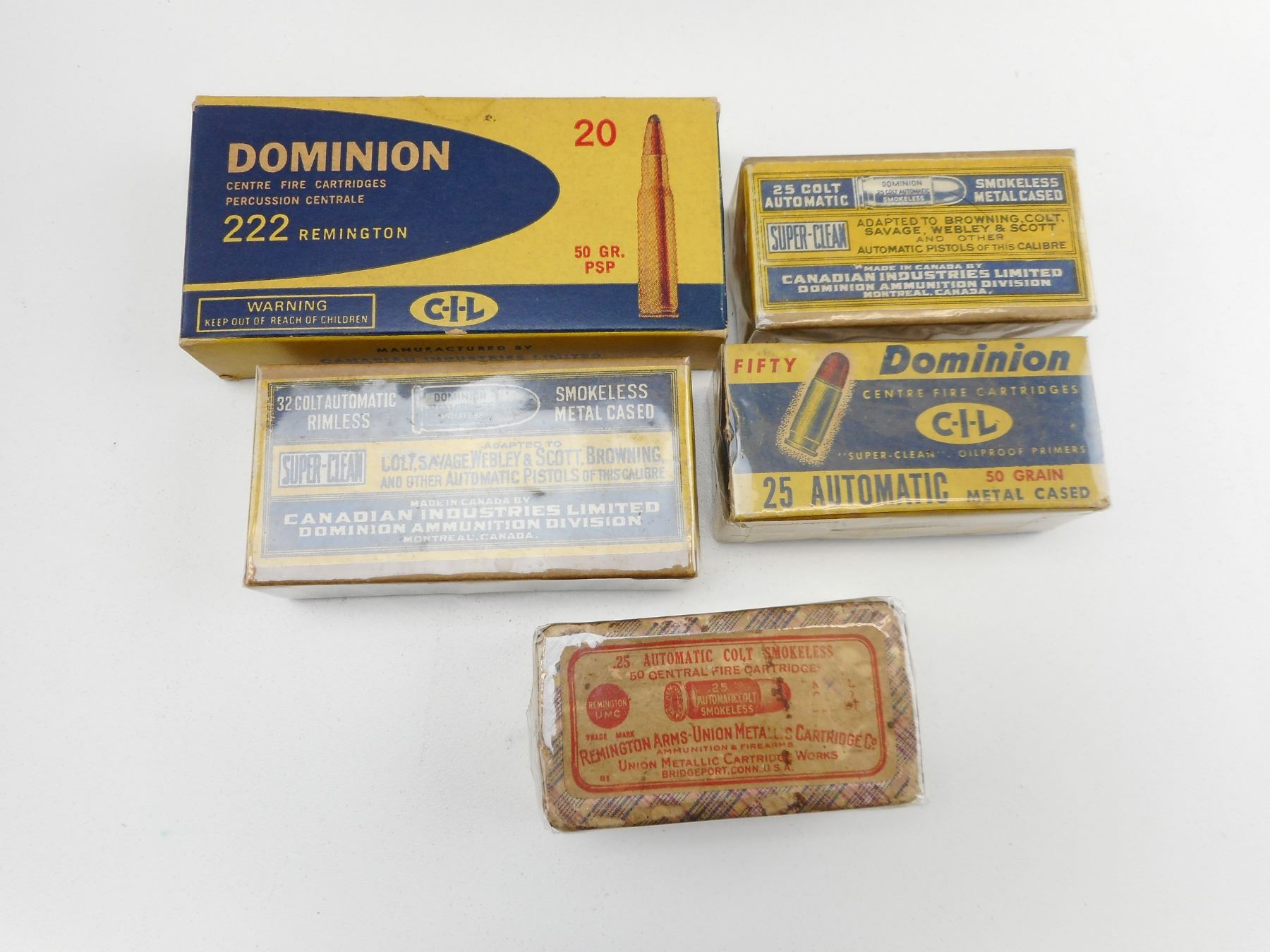 DOMINION AND REMINGTON COLLECTOR BOXES , 5 BOXES, 32 COLT AUTO, 25 AUTO COLT, 222 REMINGTON, 25 AUTO COLLECTOR BOXES