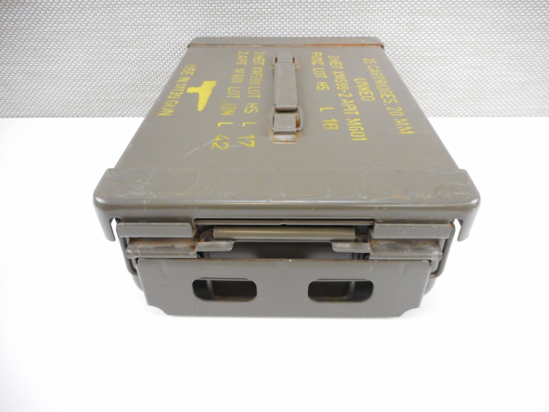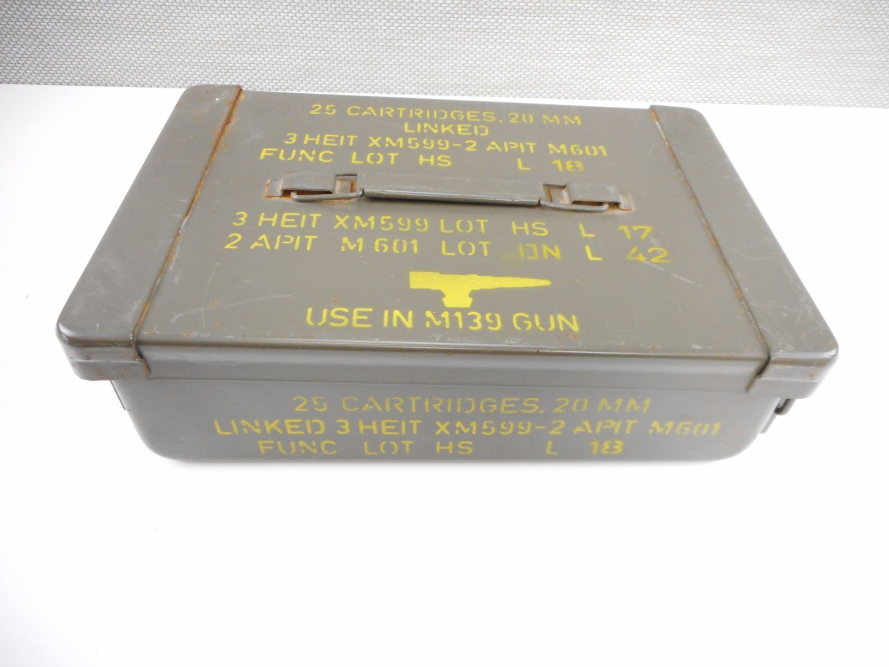 METAL AMMO TIN , APROX. SIZE 15" X 9.5" X 4.5", STAMPED 25 CARTRIDGES, 20MM , LINKED 3 HEIT XM599-2 APIT MG01, FUNC. LOT HS, L18, USE IN M139 GUN