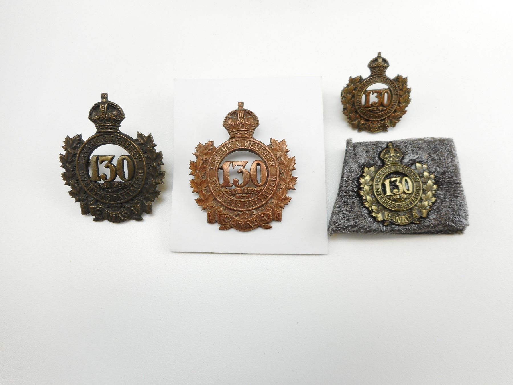 LANARK & RENFREW 130TH OVERSEAS BATTALION CAP & COLLAR BADGES , ALL LUG BACK NO PINS, LOT OF 4