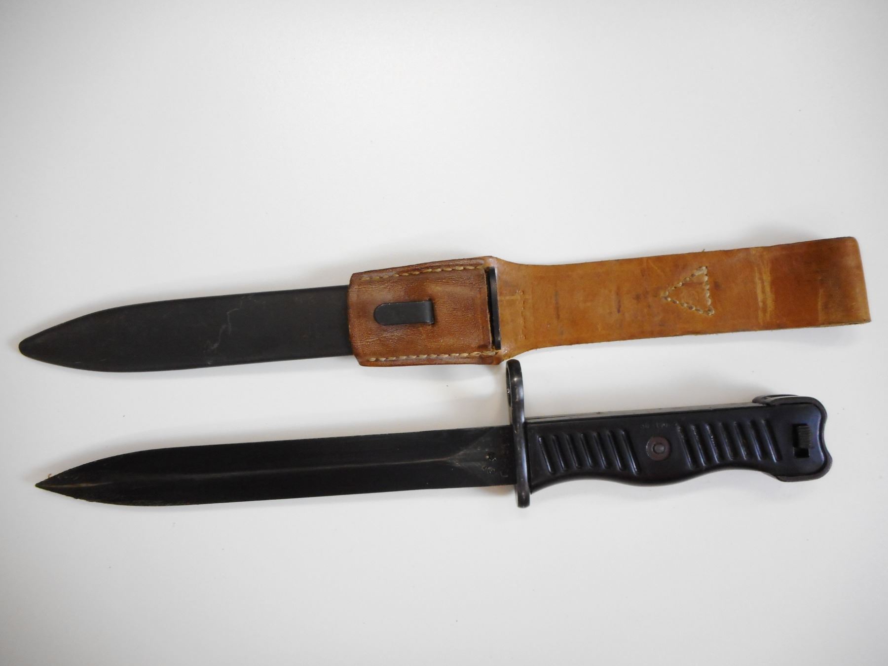 YUGOSLAV M56 SMG BAYONET WITH SCABBARD , RICASSO MARKED 36-189-6 & 52848, WITH METAL SCABBARD & LEATHER FROG