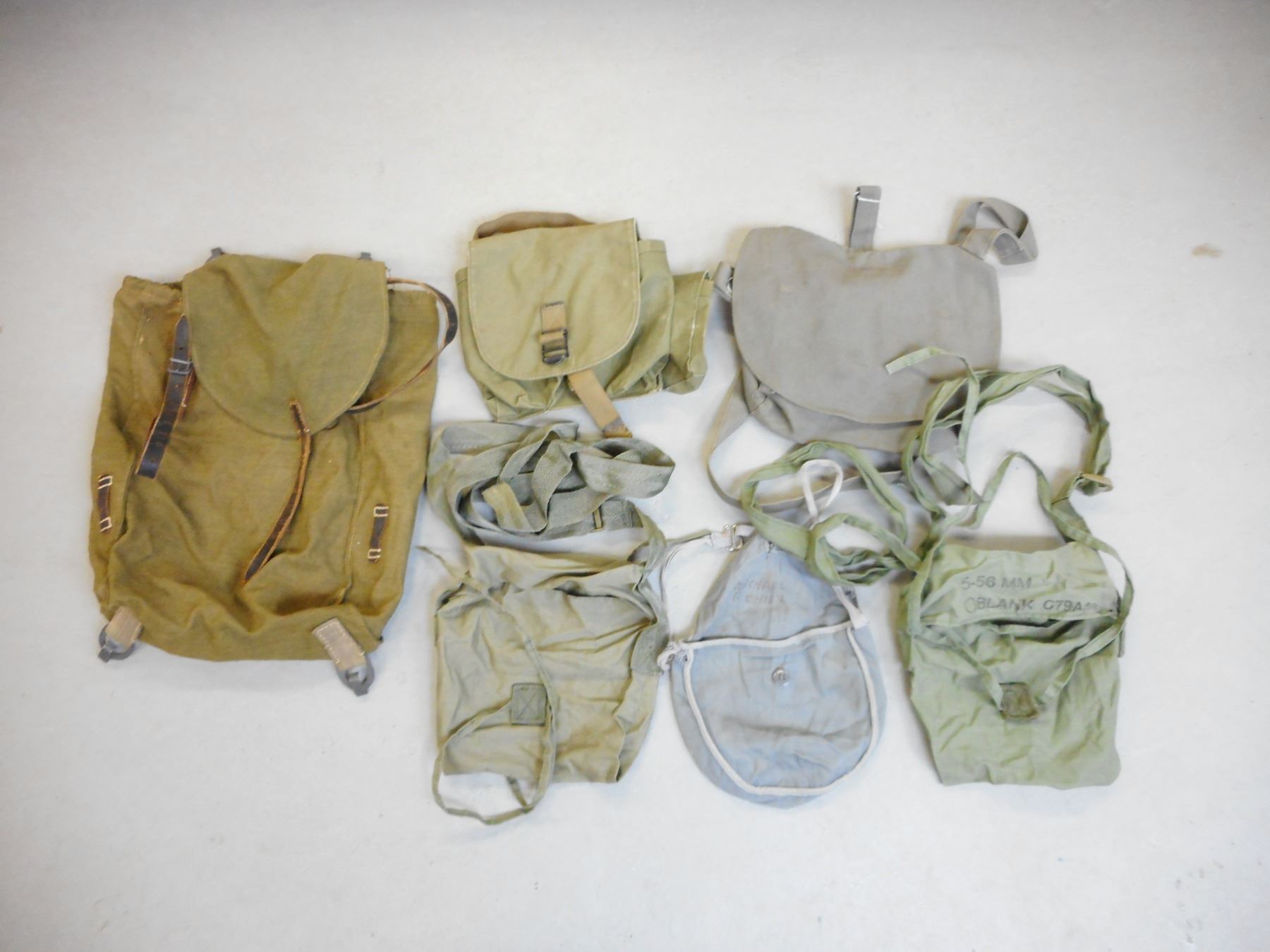 ASSORTED BAGS & POUCHES , INCLUDES SWISS BREAD BAG, AND GERMAN RUCKSACK CONSIGNOR BELIEVES LUFTWAFFE ISSUE DUE TO BLUE CANVAS REINFORCING STRAP ON BACK, LOT OF 6
