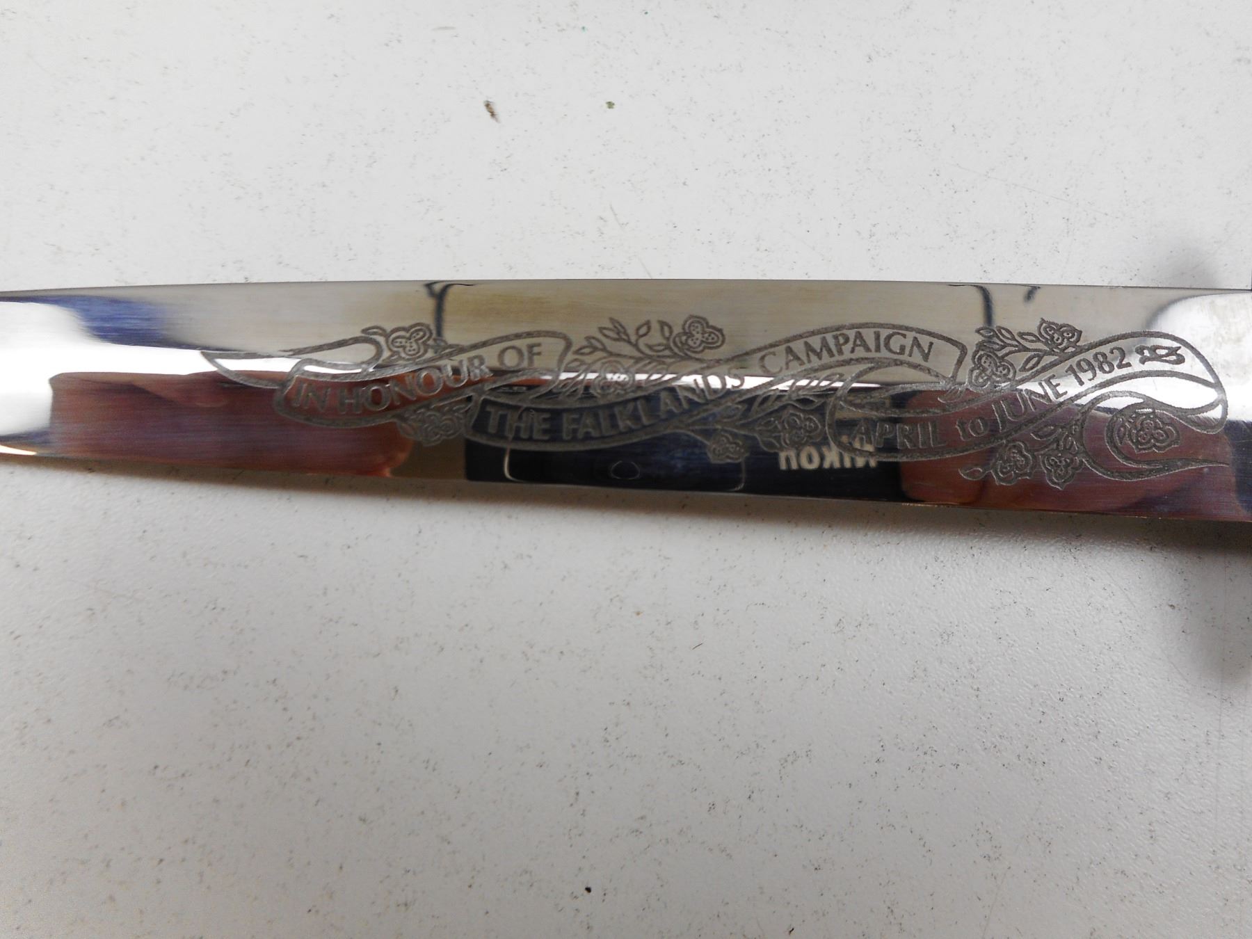 SYKES FAIRBAIN COMMEMORATIVE DAGGER WITH SHEATH , BLADE ETCHED IN HONOUR OF THE FALKLANDS CAMPAIGN APRIL TO JUNE 1982 WITH LEATHER SHEATH