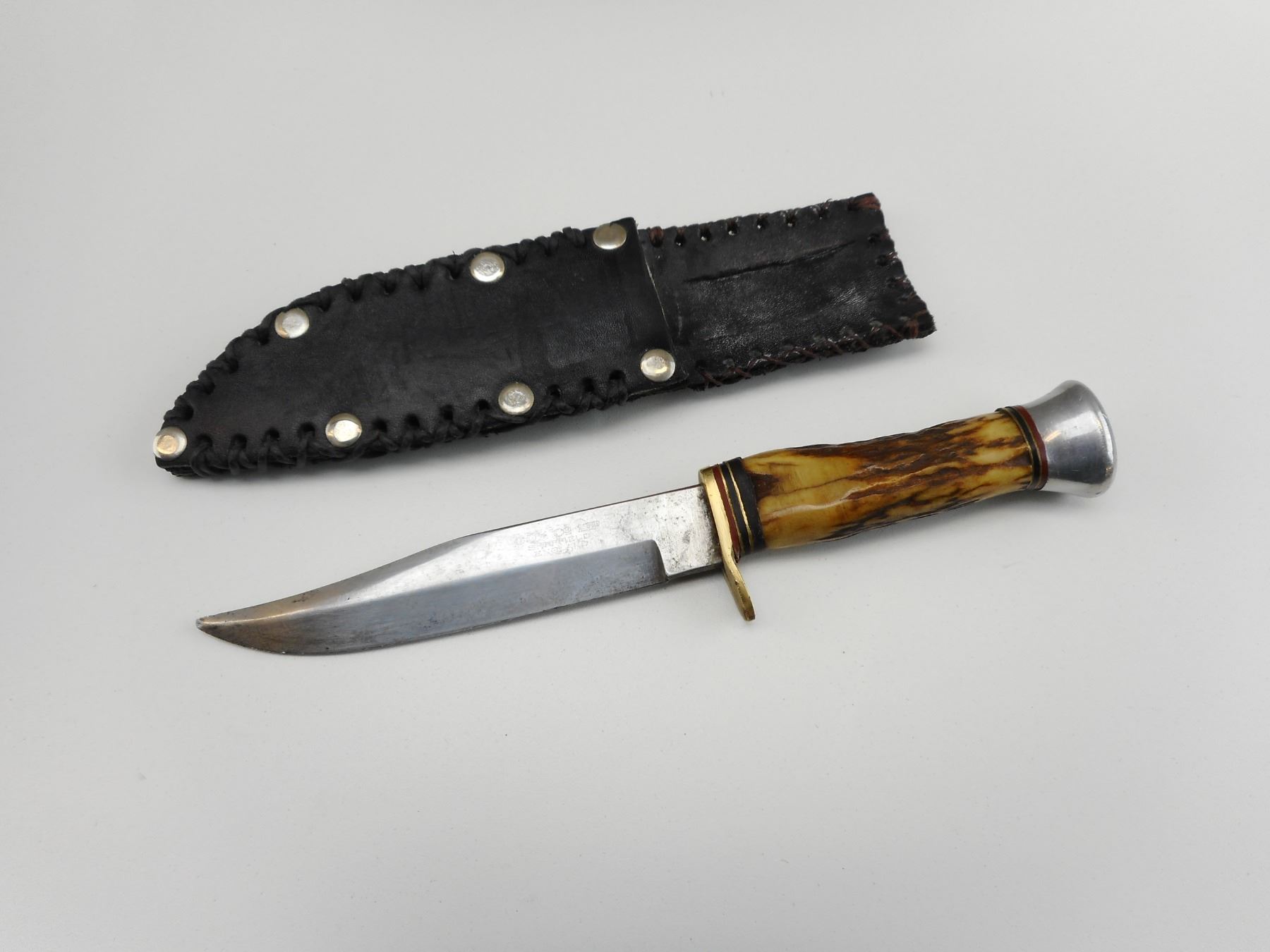 COX CO. LTD FIXED BLADE KNIFE , ANTLER HANDLE WITH 5" BLADE, BLADE ETCHED COX CO. LTD SHEFFIELD ENGLAND, WITH BLACK LEATHER SHEATH