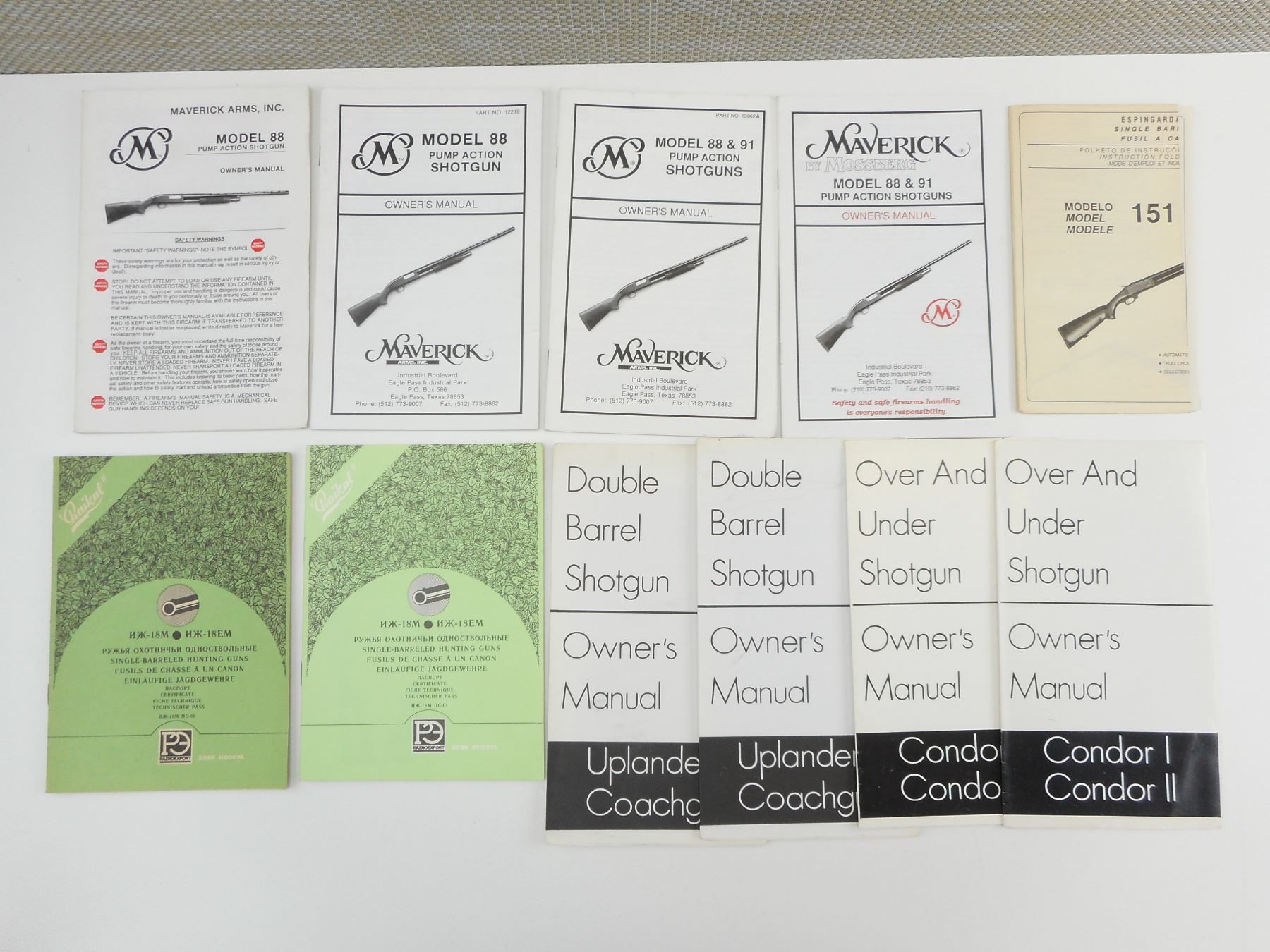 ASSORTED FIREARMS MANUALS , INCLUDES ESPINGARDA MODEL 151, CONDOR I & II OVER UNDER SHOTGUN, UPLANDER COACHGUN DOUBLE BARREL SHOTGUN, BAIKAL, MAVERICK MODELS: 88 & 91