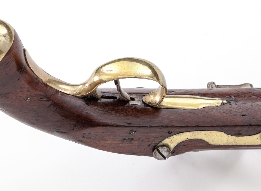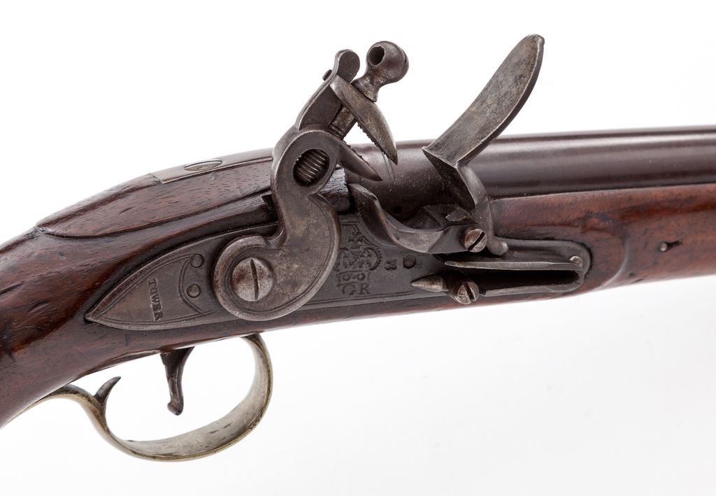 Matched Pair of British Pattern 1759 Eliott's Light Dragoon Flintlock Pistols, NVSN, .66 ''carbine bore'' smoothbore cal., 8.75'' round barrels with turned rings and two deeply struck proofmarks at breech, one breech additionally marked ''(crown)/GR/(broad arrow)'', no sights; steel lockplates having elongated rear teats with deeply struck ''(large crown)/GR'' ahead of cock and ''Tower'' vertically behind, showing slight differences in hand finishing; brass furniture including serpentine sideplates opposite locks, triggerguards, buttcaps and single ramrod thimbles. Walnut fullstocks with raised oval aprons surrounding barrel tangs, raised carved finials at rear of lockplates and to rear of sideplates; one with ''FD'' and two ''Xs'' stamped in the wood behind sideplate and ''(broad arrow)'' over ''B'' and ''O'' above buttcap, the other with ''D'' and two ''Xs'' behind sideplate and ''B O'' over ''(broad arrow)'' on right grip. Both pistols appear to be in original flintlock configuration, the touchhole areas having been polished when barrels were re-browned. Condition to both is very good to fine for their age and type, the barrels having been cleaned and re-browned at one point, the iron surfaces otherwise having a smooth brown patina; brass parts are bright. Screw head slots are straight and unmarred; one brass-tipped hardwood ramrod may be original, the other a possible replacement. Stocks are fine with clear markings, only minor age dings from their period of service, pleasing color and a coat of later varnish. Actions are smooth and tight; bores appear very good with light rust that should easily clean. Large, partitioned walnut case is of modern make, containing a reproduction copper and brass powder flask, reproduction brass single-cavity bullet mold, quantity of cast lead balls, and working key, all in very good condition. In 1759 Colonel George Augustus Eliott was tasked with raising and training the new 15th Regiment of Dragoons, initially named ''Eliott's Light Dragoons'' and later renamed ''The King's Own Royal Dragoons.'' The pistols they were equipped with were of Eliott's own design and became known as the Pattern 1759 or Eliott's Light Dragoon pistol. They saw service during turbulent times within the British Empire, including both the Napoleonic Wars and the War of 1812. Est.: $5,000-$7,500/pair. (Antique)(Joe Poyer collection)