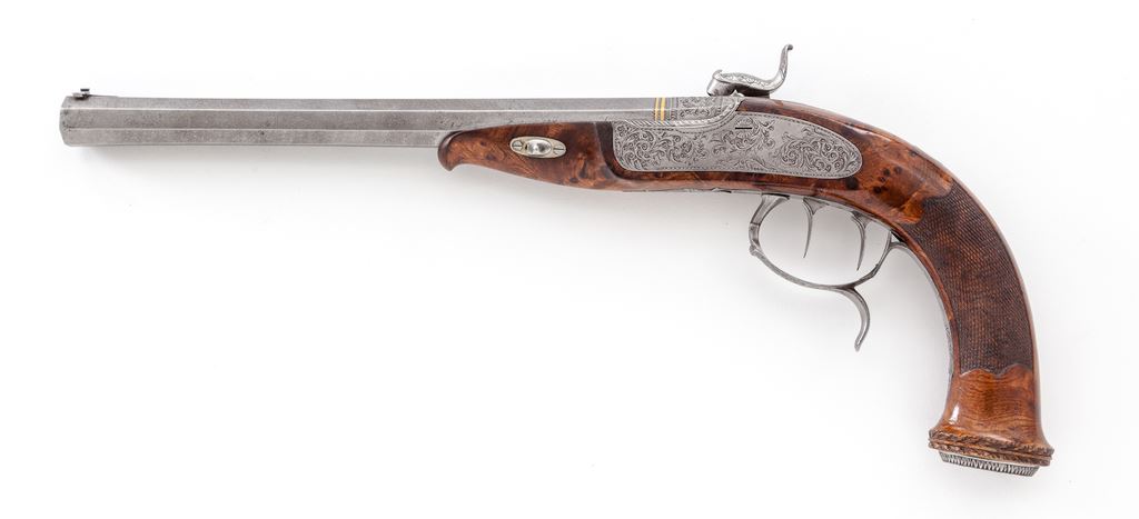 Matched Pair of High Quality Continental Halfstock Percussion Dueling-Target Pistols, by Muller in Bern, Switzerland, cased with full original accoutrements, #1 and #2 inlaid in gold atop barrel tangs, .50 cal., 10.5'' slightly swamped octagonal rifled steel barrels with overall Damascus-style etching in fine swirling patterns, marked ''Muller Gyorott'' inlaid in gold amid etched scrollwork on top flats, two inlaid gold bands at breeches, dovetailed small blade front sight, small ''V'' rear sight. Pistols are finely and elaborately engraved in a tight feathery scrolling pattern at barrel breeches and tangs, percussion bolsters with gold clean-out plugs, lockplates signed ''Muller'', sideplates, hammers, finger-spur triggerguards having pineapple finials, and buttcaps; most screw heads are engraved en suite. Stocks are deluxe burl rootwood having lovely grain patterns, Schnabel forends, vacant oval German silver escutcheons at wrists, checkered and bordered panels at grip sides, and delicately carved oval buttcap surrounds. Double set triggers. Originally finished in the ''white'' in the European style, with varnished hardwood stocks. Condition is fine to excellent with overall smooth, bright metal; pistol #2 having slight black powder erosion at nipple area; barrel bands missing one or two small areas of gold inlay. Stocks are excellent showing lovely grain, sharp checkering and carving, and retain all of their original varnish; the stock of pistol #1 may have had a wood repair on right side above the wedge escutcheon, or it may be the grain pattern (it is difficult to discern which). Actions are extremely tight; pistol #1 does not hold at cock; bores are bright with sharply defined rifling. The pistols are housed in their original burlwood French-fitted case lined in green baize, having individual compartments for two rosewood rods with burl knobs, steel bullet worm and two other small tools, nipple wrench with burl handle, steel single cavity bullet mold, steel patch cutter, burlwood mallet, percussion cap receptacle with burl lid, assorted patches and cast lead balls. Accoutrements are excellent; case is good to very good with a full-width crack across lid, chips and losses to the veneered exterior, but sound and complete. Est.: $5,000-$7,500. (Antique)