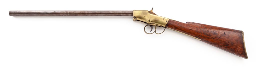 Exceedingly Rare Set of Breech-loading Carbines, by Loughlin Conroy, New York City, and possibly Nimschke engraved. Two of these carbines were protected by U.S. Patents dated Dec. 1867 and June 1869, and were twice submitted to small arms boards for consideration, first at the New York State trials in 1868, then before the U.S. Army Board meeting in St. Louis, MO, in 1870. In an article by Gerald Denning in the American Society of Arms Collectors Bulletin 40:34-44, entitled ''Rare Pairs, Gentlemen of invention, we salute you!'', Mr. Denning states that the engraving was ''apparently executed by the famed arms engraver, Nimschke, whose shop was located a few doors from Conroy's in New York.'' (1) The first carbine is approx. 50 cal., 22.75'' round barrel, with brass frame, triggerguard, buttplate and single brass band. Left side of frame is marked ''L. Conroy, N.Y./Pat. Dec. 31, 1867.'', and in script ''New Model 1869'' in scroll. Right side of frame and upper tang are marked in small letters ''L. Conroy, N.Y./Pat. Dec. 31, 67/June 15, 69''. Breech and upper tang are also engraved in typical Nimschke style. (2) The second carbine is mentioned as Conroy's workshop model and not a working firearm, ''intended by the inventor to keep from going into production with unresolved problems.'' (Pictured in Denning's article as Plate 24.) 21.5'' barrel, unmarked frame and buttplate, no forend. (3) The third iron framed model is approx. .45 cal., 22.25'' round barrel, with one barrel band and typical Nimschke style engraving at top of buttplate. Both sideplates are marked ''L. Conroy, N.Y.'' in small letters. Top of tang is stamped ''L. Conroy, N.Y./Pat. Dec. 31, 67/June 15, 69''. Rear sight is marked ''R.S. Lawrence/Patented/Feb. 15th, 1869'' (common to Sharps rifles and carbines). Mr. Denning lists this third ''magnificent companion piece'' as displaying ''many sophisticated design improvements, and with the exception of the earlier trials rifle, is the only iron-framed model known to me.'' (See page 106, ''Digest of Patents relating to Breech-Loading and Magazine Small Arms'', by V.D. Stockbridge, N. Flayderman, Publisher, 1963; and the article ''Conroy Rifles'', by Ed Hull, page 20 of the Gun Report Magazine, July 1984 {copies included}.) Considering their age and rarity, all three carbines are in good to fine condition, showing a varying degree of workmanship from Conroy's workshop model to the example with design improvements. Only a few of Loughlin Conroy's patent arms are known to exist. Est.: $9,000-$12,000. (Antique)