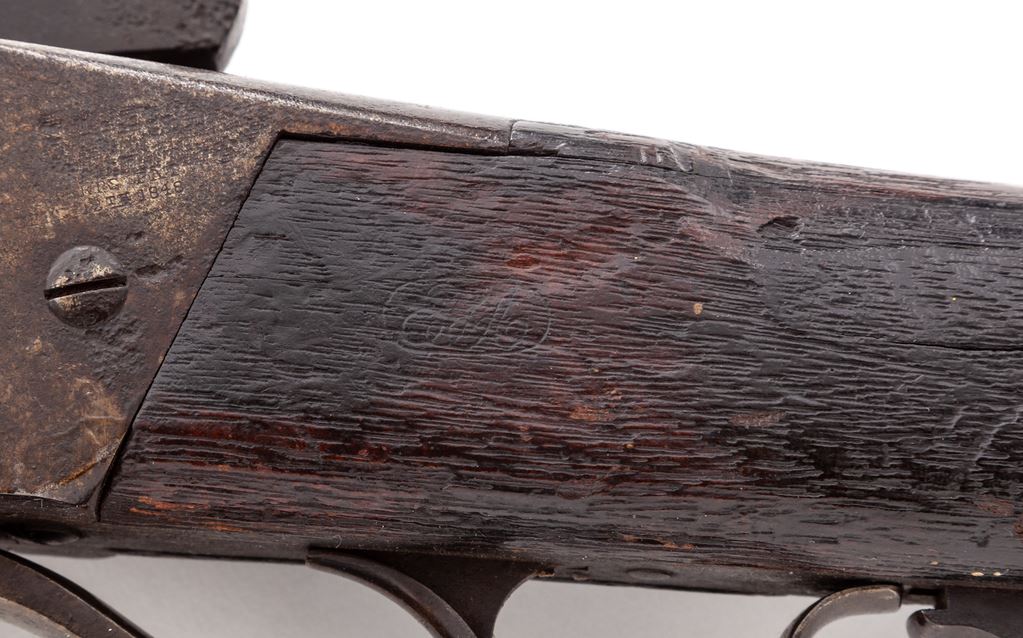 Springfield Armory-Sharps Model 1870 Second Type Cartridge Infantry Rifle, #218, .50-70 CF cal., 35.5'' round barrel, ''U.S.'' marked on buttplate tang (markings other than serial number and U.S. are obscured due to heavy pitting), originally ''bright'' and case hardened finish, one-piece walnut stock with oval inspector stamp on left wrist, two iron barrel bands, and iron ramrod. Mfg'd circa 1870, with total production limited to approx. 1,300 guns. Condition is fair to good showing an overall dark aged patina to steel parts, heavily pitted in places. Stock is straight and solid showing nicks and gouges, with two original sling swivels. A complete and untouched example of a quite scarce variation U.S. rifle that was fabricated as an entirely new model, and not merely an arsenal conversion. Action is crisp, dark bore. Est.: $2,000-$3,000. (Antique)(Joe Poyer collection)