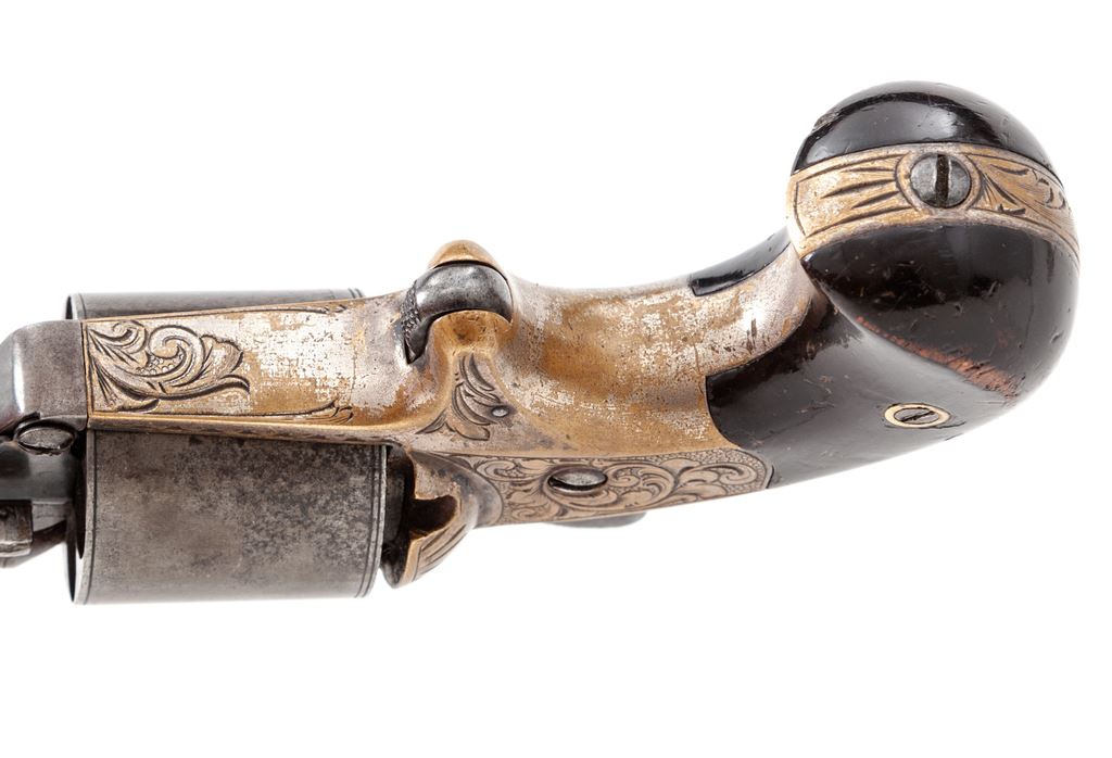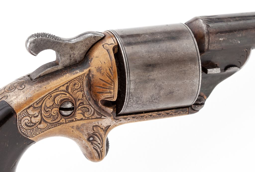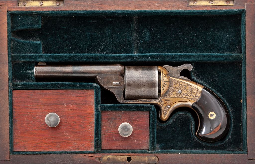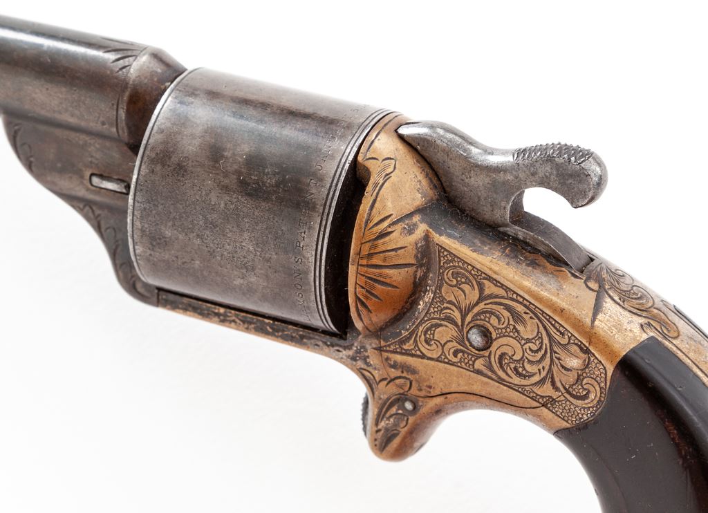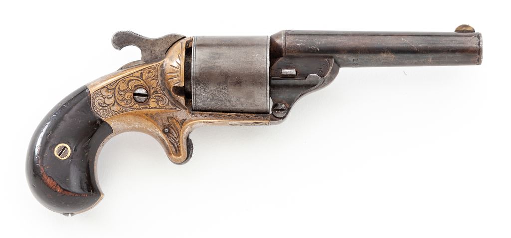 Cased Moore's Patent Front-Loading Cartridge Civil War Pocket Revolver, #18063, .32 teatfire cal., 6-shot, 3.25'' round steel barrel with integral blade front sight marked ''Moore's Pat. Fire Arms Co. Brooklyn N.Y.'' and with floral engraved flourishes at muzzle and lug. Plain cylinder engraved on rear circumference ''D. Williamson's Patent January 5, 1864''. Nicely floral engraved brass spur trigger frame. Originally blued steel and silver plated brass finishes, with dark varnished walnut grips. Daniel Moore and David Williamson's front-loading design was another, and successful, attempt to circumvent Rollin White's bored-thru cylinder patent then controlled by Smith & Wesson. Condition is very good showing approx. 50%-60% thinning original blue to barrel and cylinder; approx. 10%-15% original silver mostly on bottom frame; most grip varnish with losses at high points. Action is smooth but does not revolve cylinder; bore appears clean with good rifling. Period case of brass-bound rosewood veneer is very good, missing circular brass key escutcheon and one brass inlay at front of top; fitted semi-French style teal green velveteen interior is fine; two wooden compartment covers with brass knobs. Est.: $1,200-$1,800. (Antique)