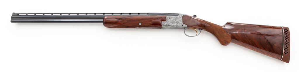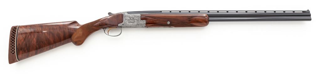 Exceptional Browning Superposed Diana Grade .410 Skeet Gun, #1730J6, .410 bore, 26.5'' vent rib barrels with target beads, 3'' chambers, choked SK/SK. Action is grey in color, profusely engraved with pheasants, ducks, quail and rabbits. Forend is early slender configuration, and buttstock has round knob pistol grip and original Browning recoil pad. Both are of dark Exhibition Grade walnut and feature extensive 26 LPI checkering. Mfg'd 1966. Condition is absolutely excellent, appearing unfired, with almost no handling marks, no wear, and no condition degradation to the elaborate engraving. A beautiful example of this rare Superposed configuration. Est.: $8,000-$12,000. (Modern)